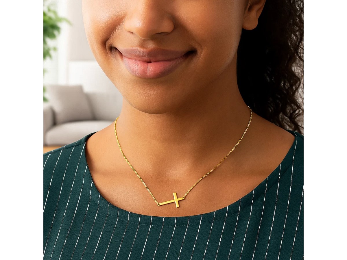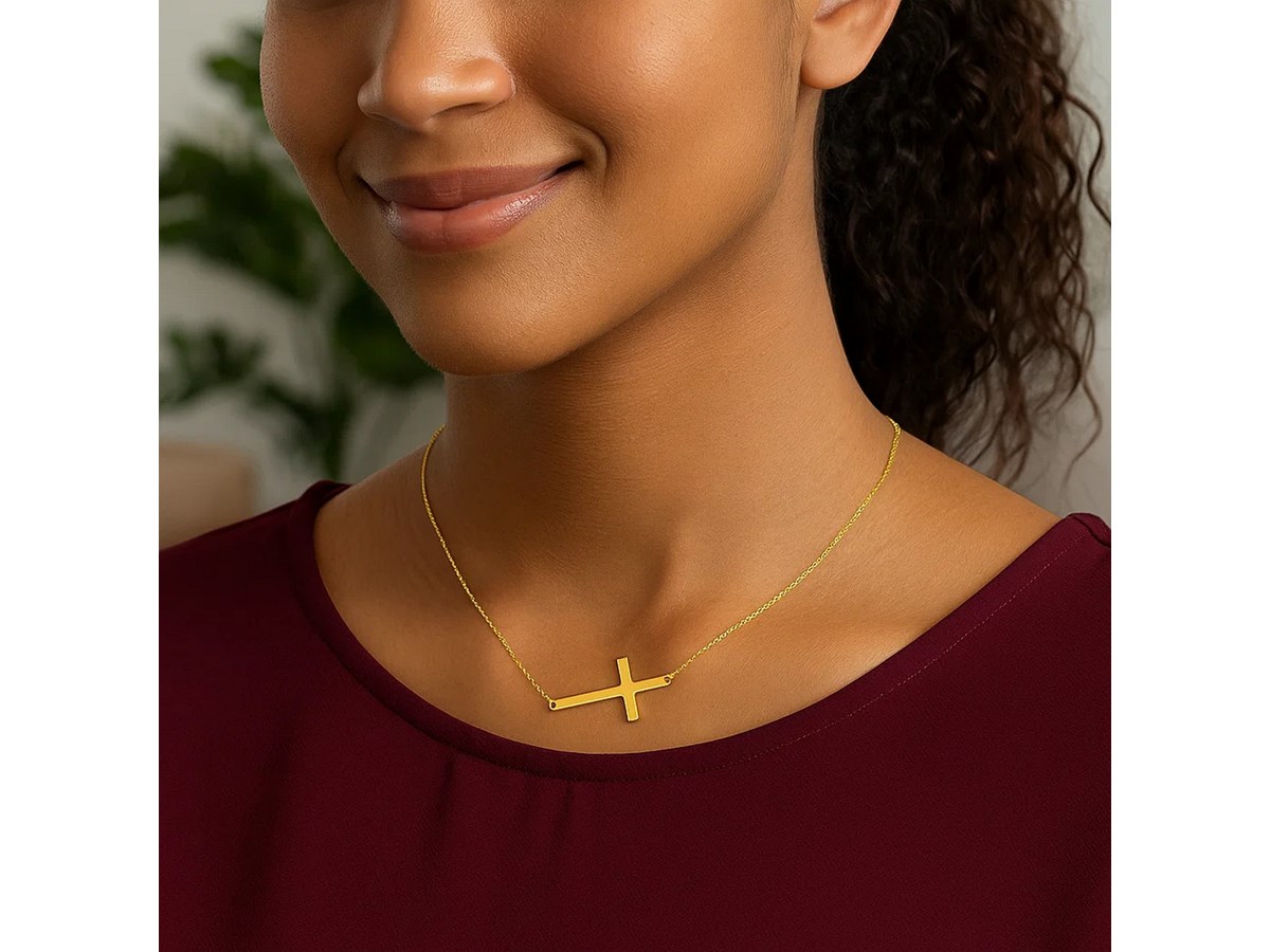 A simple yet beautiful necklace showcasing a chain connected to the ends of a flat cross. Wonderfully crafted in 14k yellow gold and measures 18 inches.