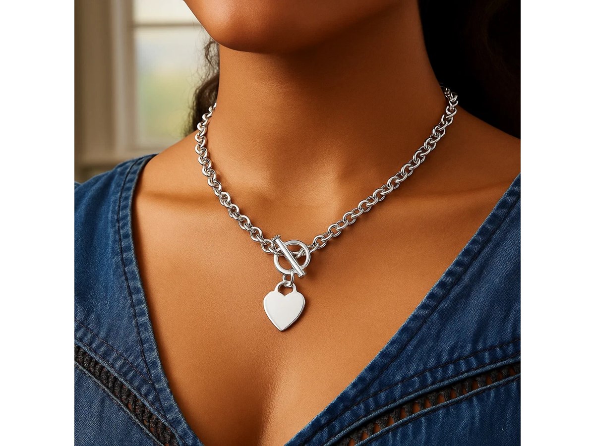 This is a sweet rhodium plated rolo chain necklace showcasing a toggle lock with a flat heart charm. Available in sizes 16 inches and 18 inches.