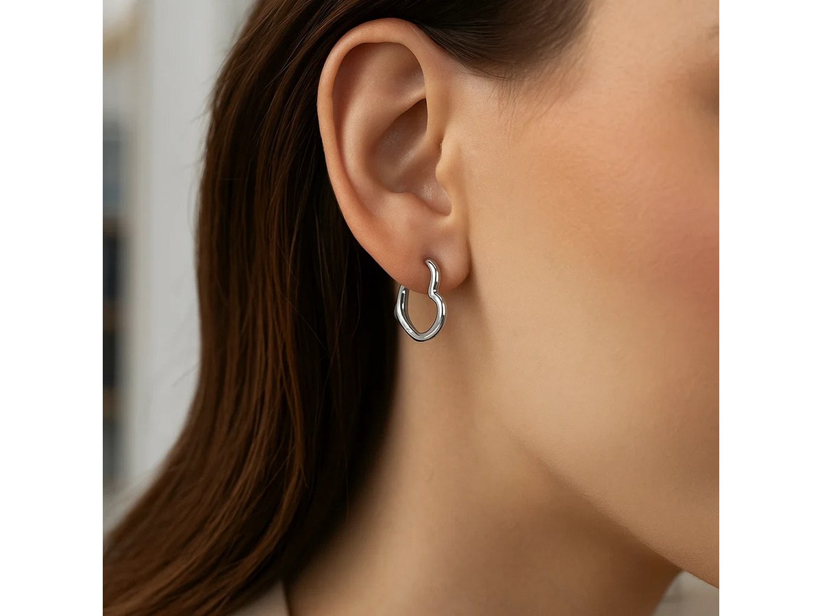 These earrings are crafted in 10k white gold and feature heart shaped hoops. Secured with a snap post backing.