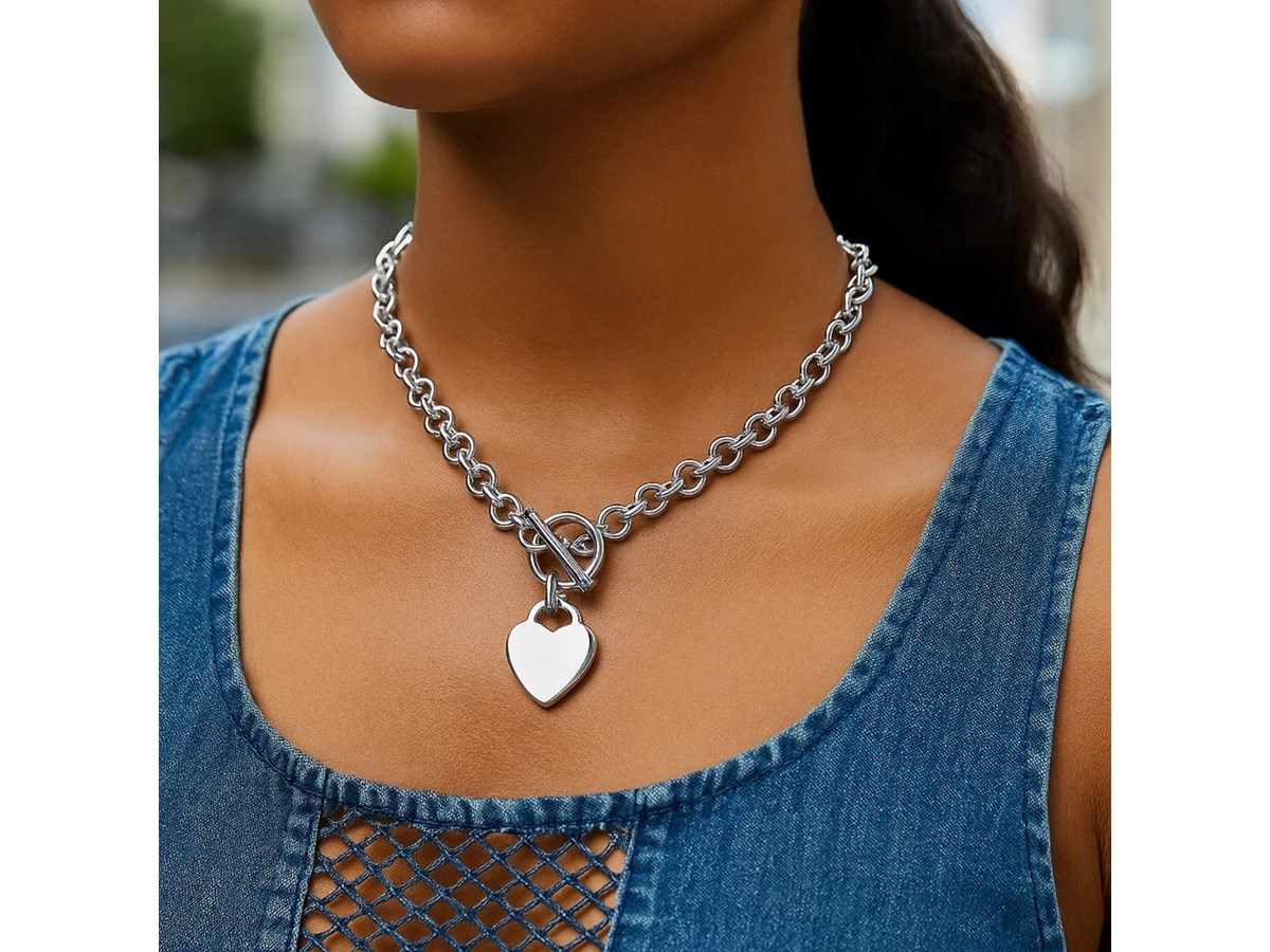 Showcasing a flat heart motif charm hanging from the toggle lock, this rhodium plated sterling silver necklace is a beauty. Comes in sizes 18 inches.
