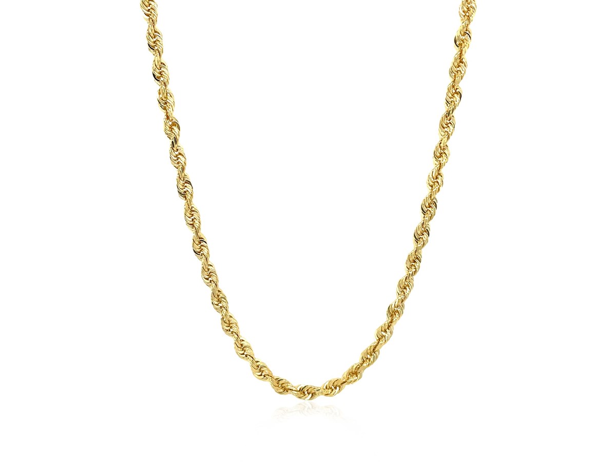 Hollow diamond cut rope chain crafted in 14K yellow gold measuring 3.2 mm in width. Available in lengths 18 inches, 20 inches, 22 inches and 24 inches.