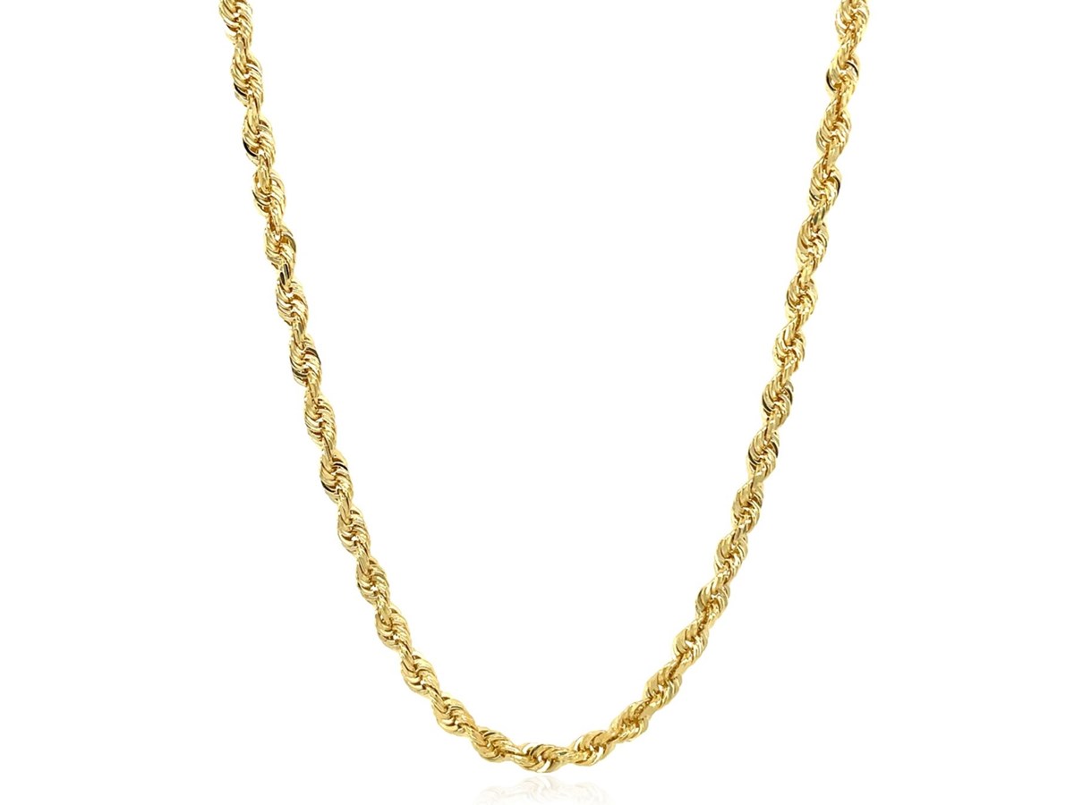 Hollow diamond cut rope chain crafted in 14K yellow gold measuring 4.0 mm in width. Available in lengths 18 inches, 20 inches, 22 inches and 24 inches.