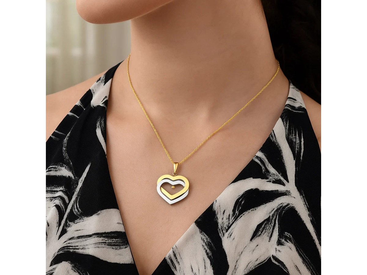 Expertly crafted in two-tone gold, this double heart pendant features a moving heart that rotates on its headpin. 18 inches box chain included.
