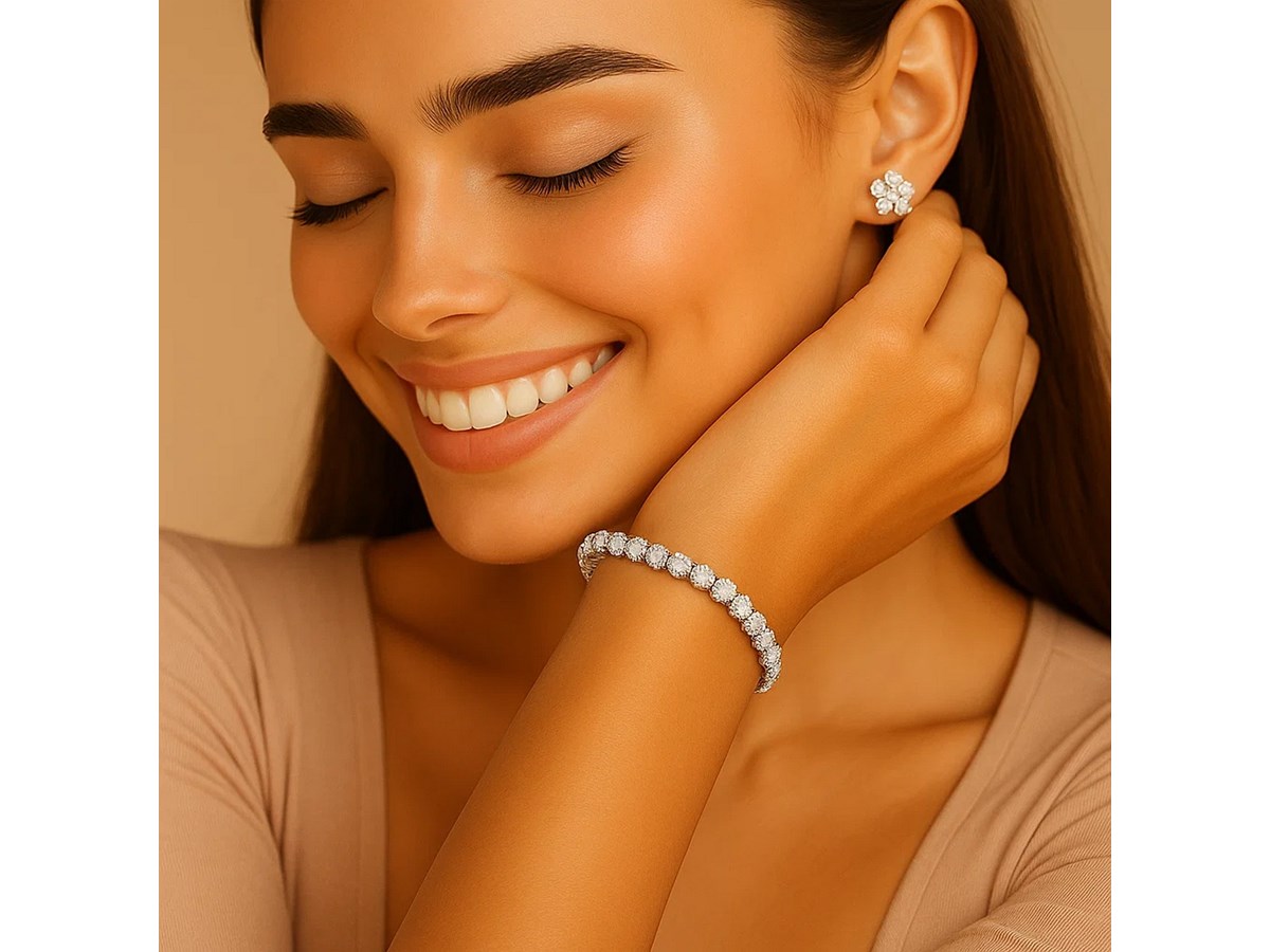 Classic four prong 5 carat total weight diamond tennis bracelet showcasing perfectly matched brilliant round cut lab grown diamonds set in 14k white gold.