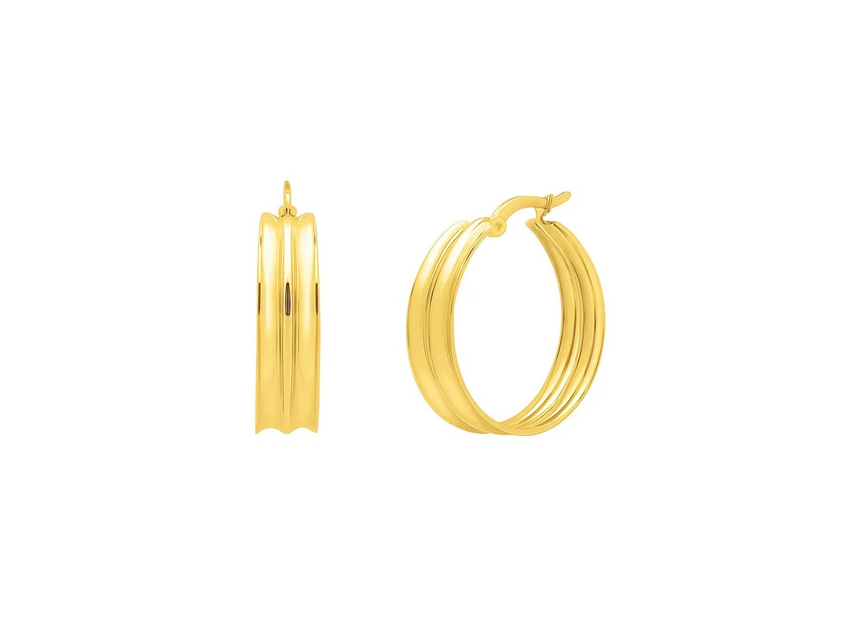 Designed with subtle elegance, these 14k Yellow gold large concave hoop earrings showcase a striking double-row design that radiates sophistication. The concave silhouette adds depth and dimension while the polished finish shines. Secured with a hinged clasp for effortless wear, these hoops are a timeless statement piece.