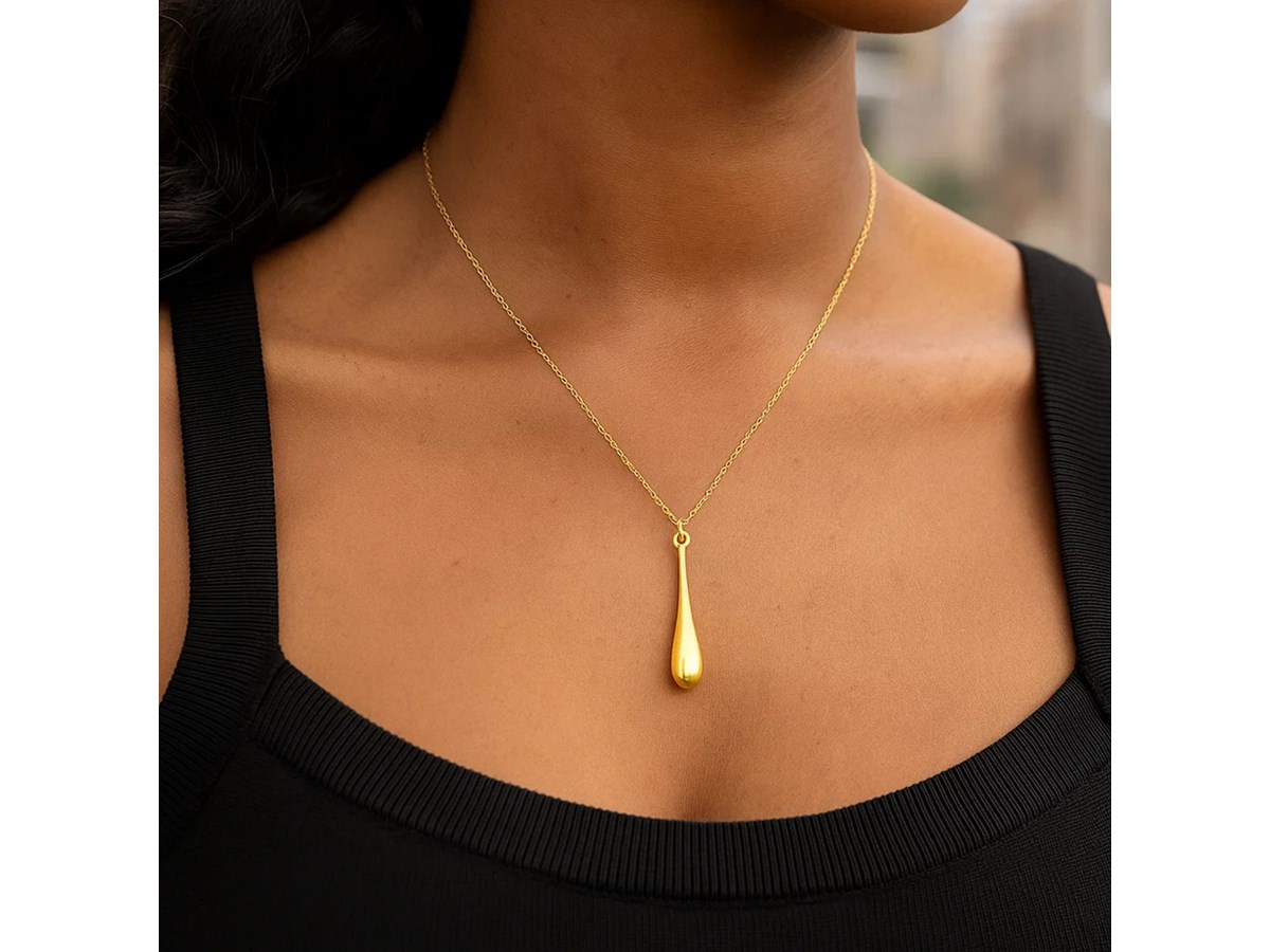 This is a sophisticated pendant in a long teardrop style. Quite gorgeous in 14k yellow gold.