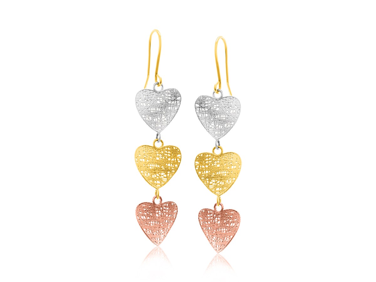 Fashionable and cute, this pair of dangling earrings features mesh hearts in a chain. Designed in 14K tri-color gold.
