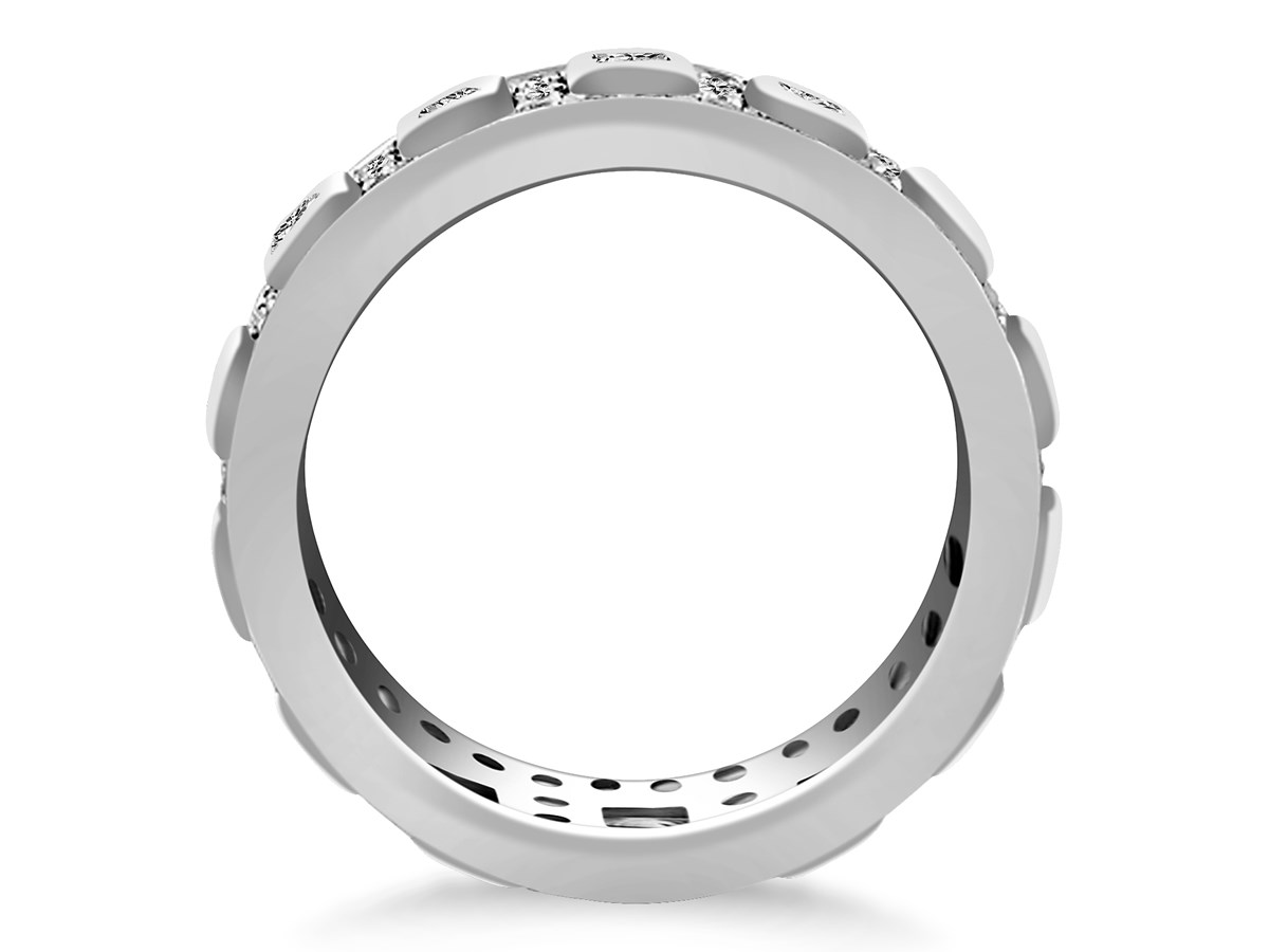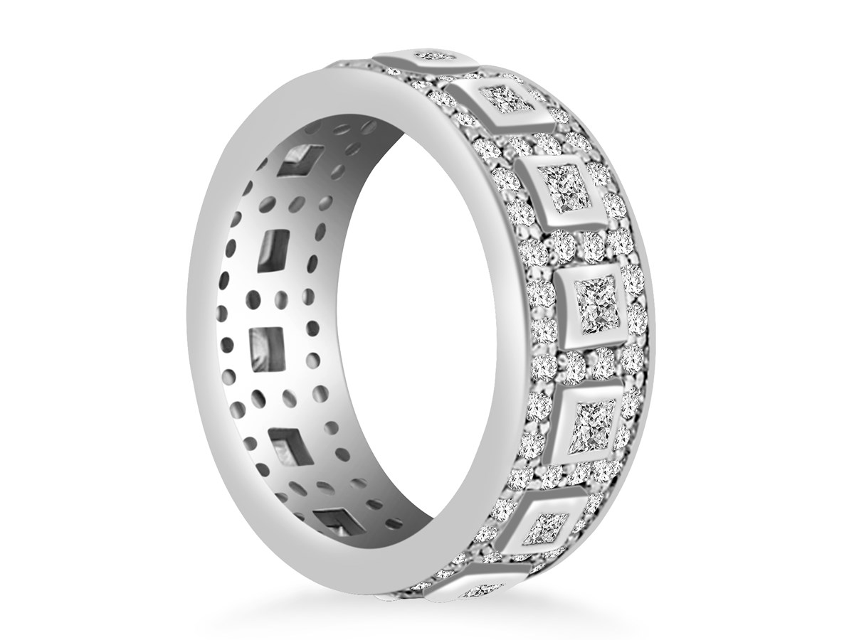 This unique eternity ring features pave set round diamonds accentuated with dotted bezel set princess cut diamonds. Crafted in 14K white gold.