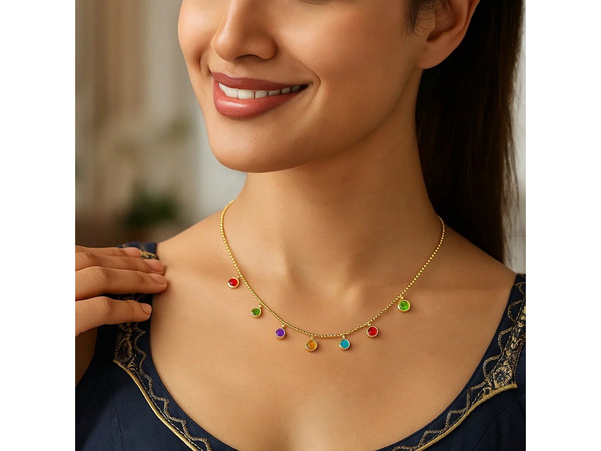 This darling cable chain necklace features round stone charms in several colors. Made of 14k yellow gold, this comes in size 16 inches and 18 inches and is secured with a spring ring lock.