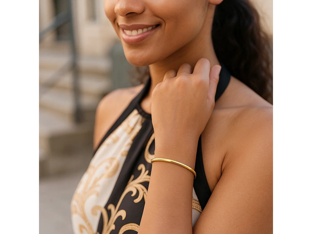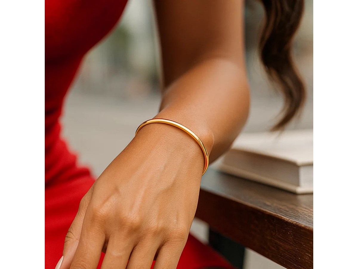 This shiny slender bangle features an elegant dome style. Made of 10k yellow tone gold.