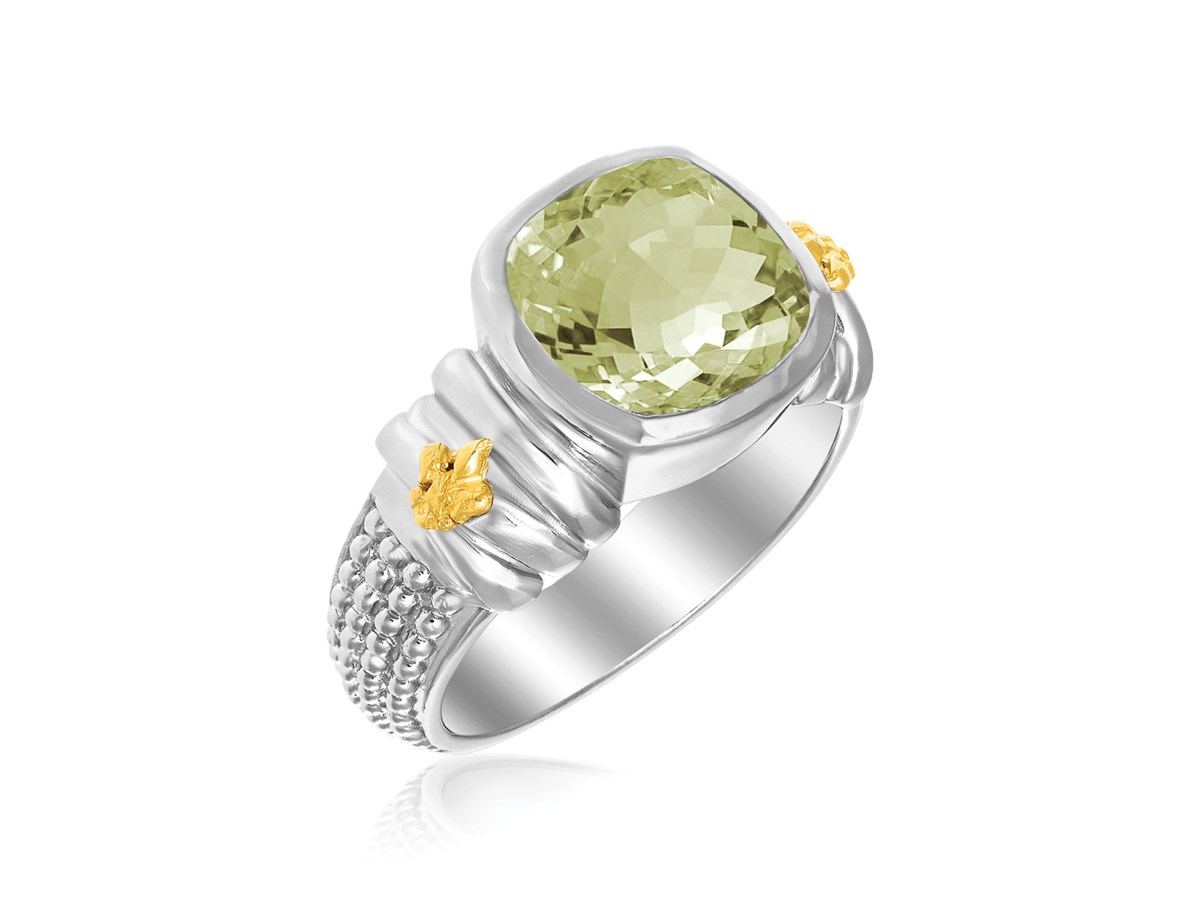 A darling cushion green amethyst adorns this 18K yellow gold and sterling silver fleur de lis accented ring. Showcasing a popcorn band, this is available in sizes 7 to 9.