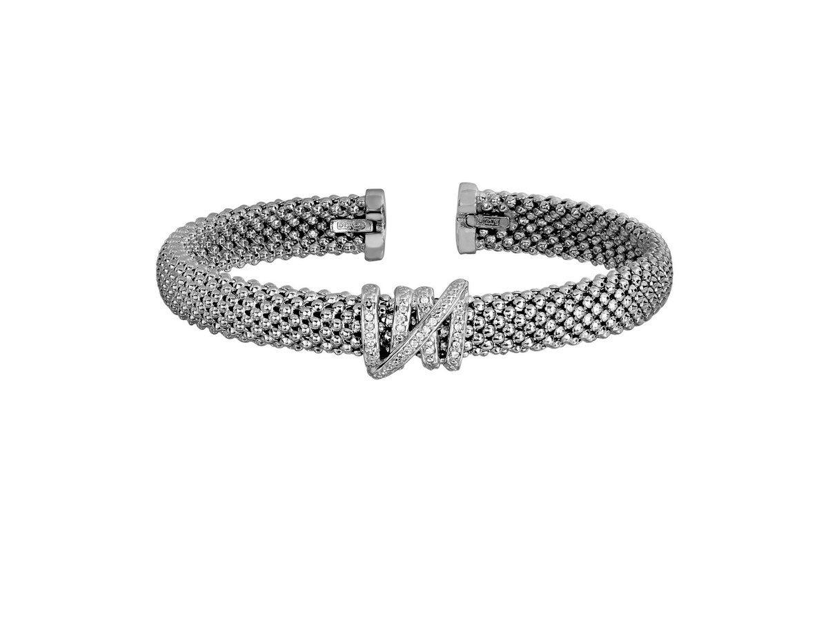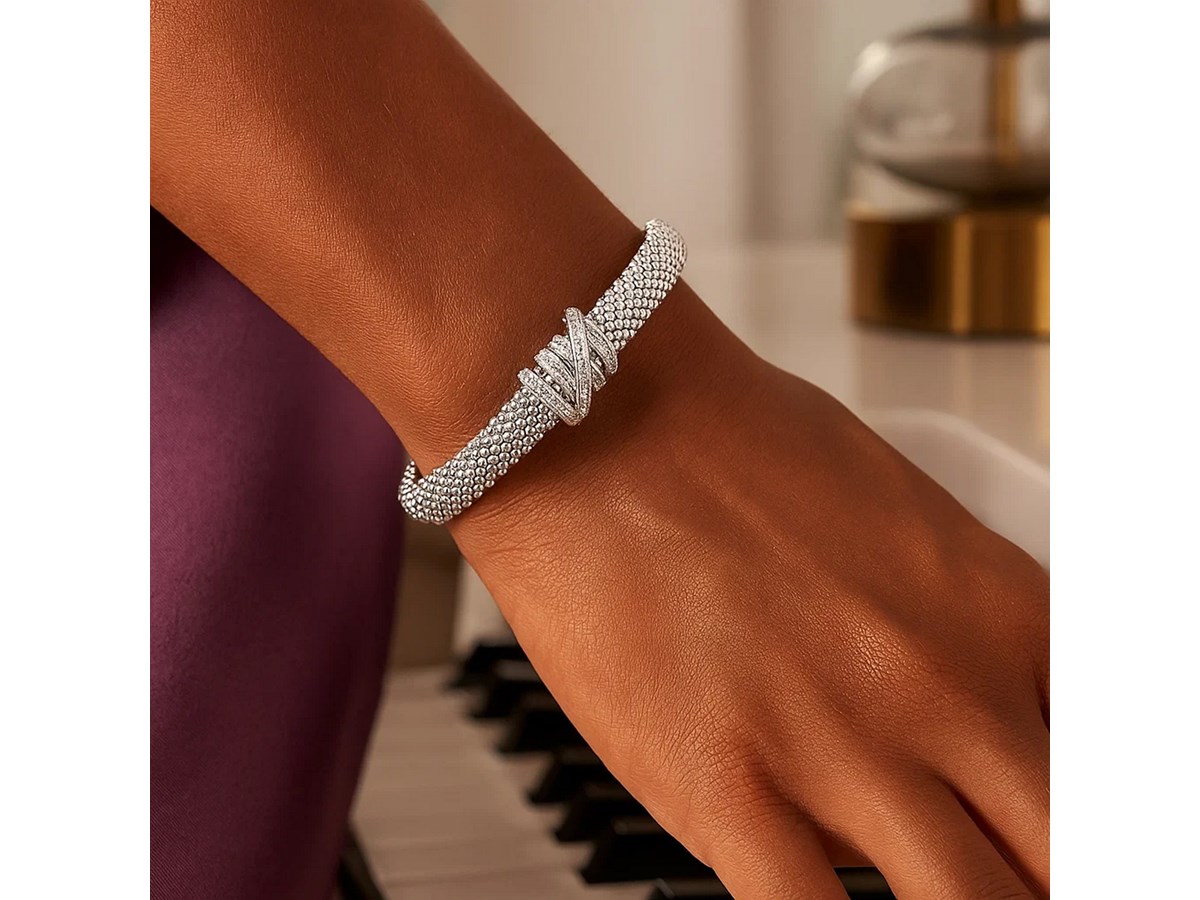 This modern, sophisticated sterling silver bangle features crossing bands of twinkling diamonds and am intriguing popcorn texture.