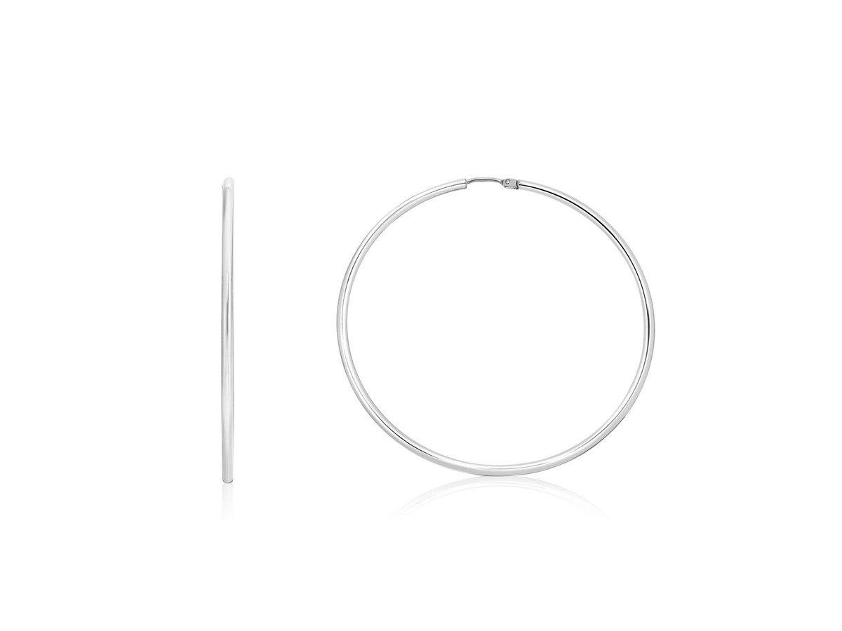 Elegant rhodium-plated endless hoop earrings in sterling silver. Featuring a seamless circular design with a polished finish, these lightweight hoops offer timeless shine and sophistication, perfect for everyday wear or special occasions.