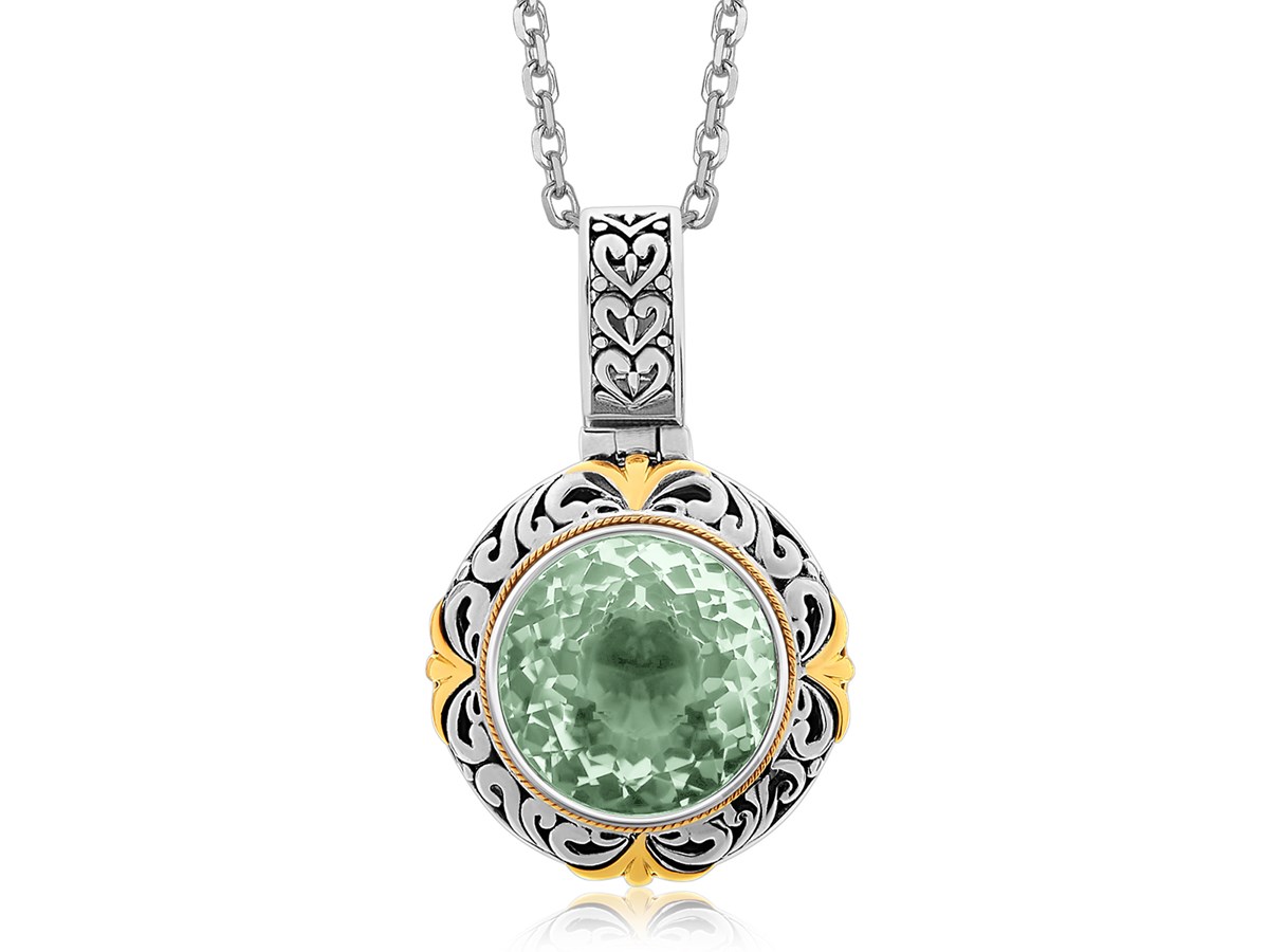 Round Green Amethyst Vintage Style Pendant in 18K Yellow Gold and Sterling Silver