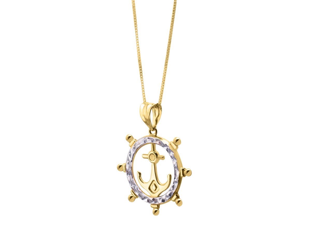 Symbolizing strength, stability, and guidance, this 10k two-tone gold pendant showcases an anchor resting within a ship’s wheel. Representing the steadfastness of an anchor and the navigation provided by a wheel, it serves as a meaningful emblem of resilience and purpose, carrying a profound message of navigating life’s journeys.