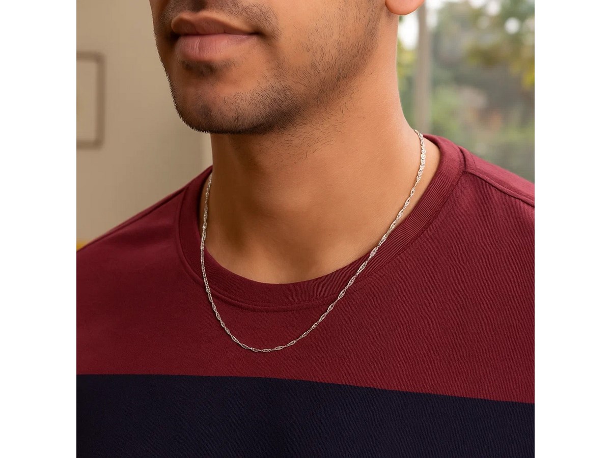 Singapore chain crafted in 14k white gold measuring 1.10 millimeters in width. Available in lengths 16 inches, 18 inches, 20 inches, and 24 inches.