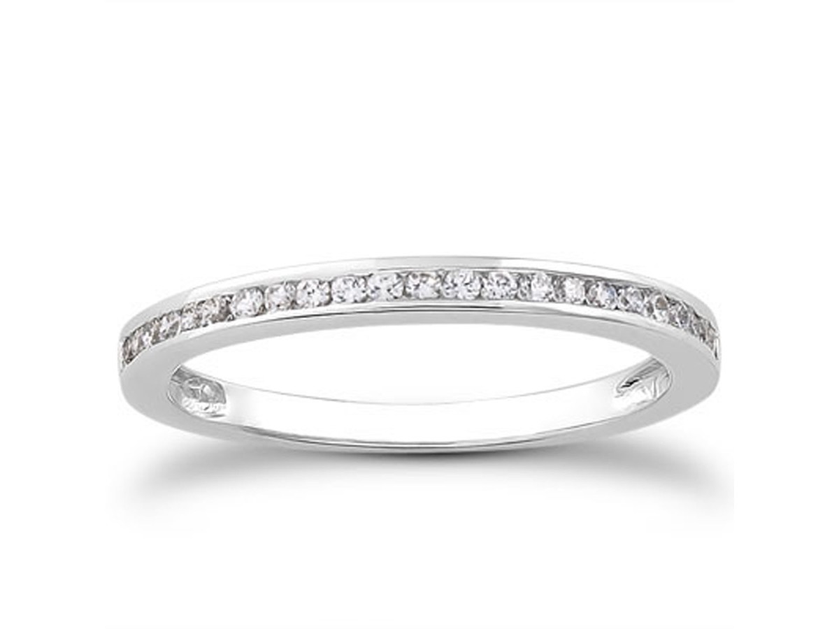 The slim profile classic channel set diamond wedding ring features twenty three brilliant diamonds set half way around the band. Expertly crafted in 14k white gold, the high polish adds luster.