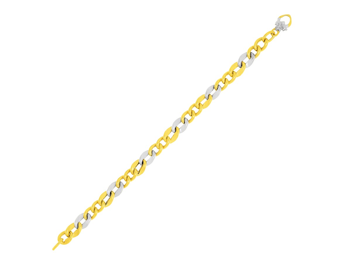 This chain bracelet showcases smooth curb links made of 14K two-tone gold. Measuring 7 1/4", this comes with a fleur de lis lobster lock.