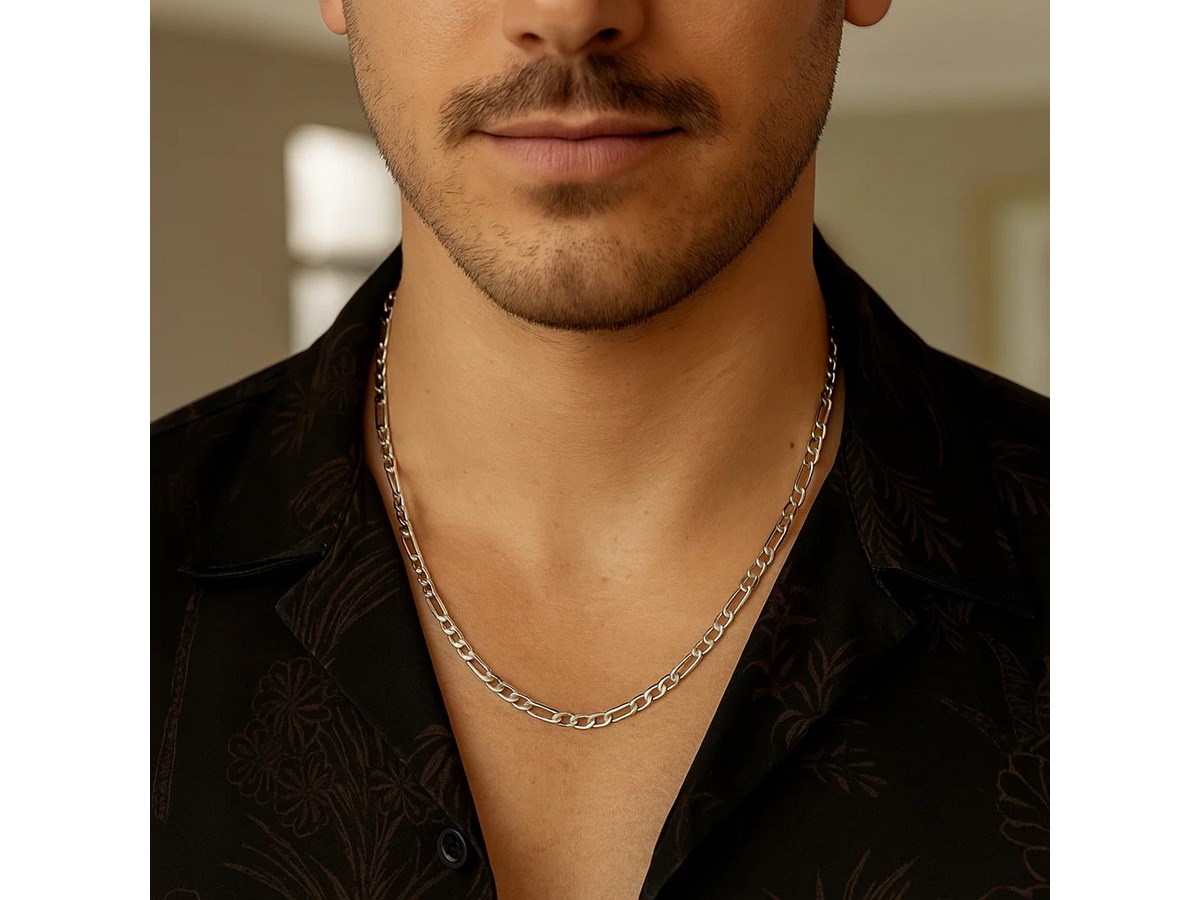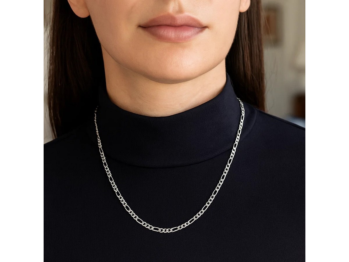 Solid Figaro chain crafted in 14k white gold measuring 3.00 millimeters in width. Available in lengths 18 inches, 20 inches, 22 inches and 24 inches.