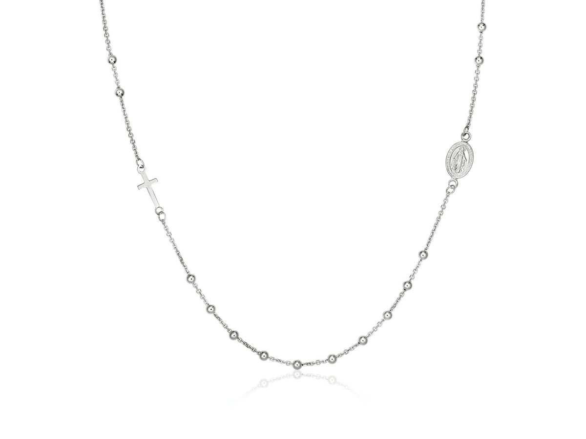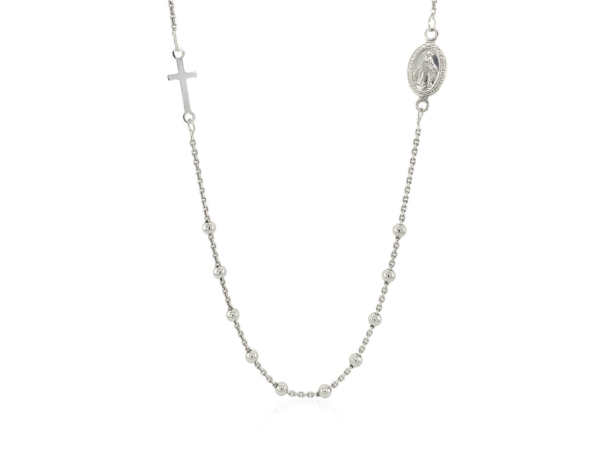 A delicate, modern interpretation of a classic rosary, this inspiring strand sterling silver necklace is punctuated by polished round beads, and decorated with a cross and a religious medallion. Necklace is 20 inches long and closes with a lobster clasp.