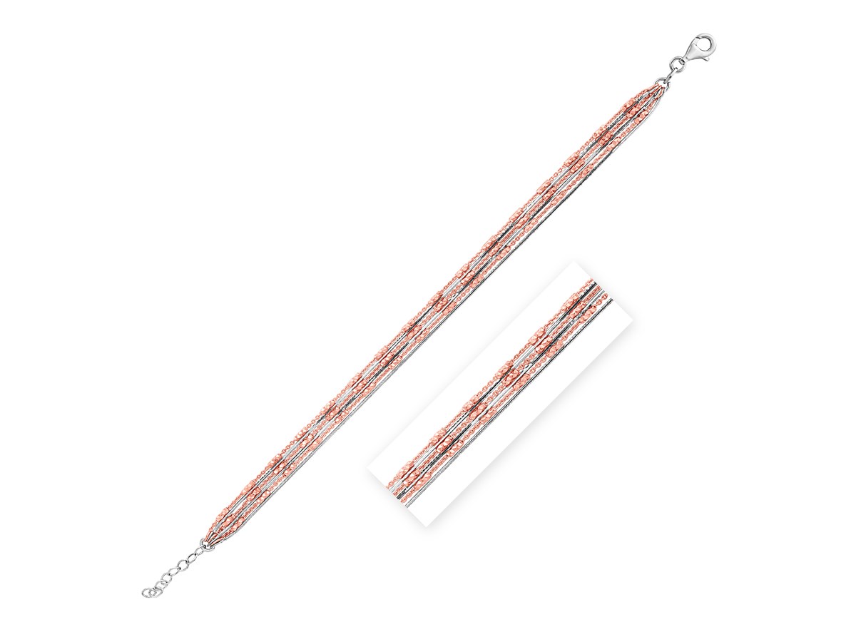 A multitude of sterling silver and rose-finish sterling silver chains cascade in unison across your wrist in this unique bracelet. Bracelet is 7 1/2 inches long and closes with a lobster clasp.