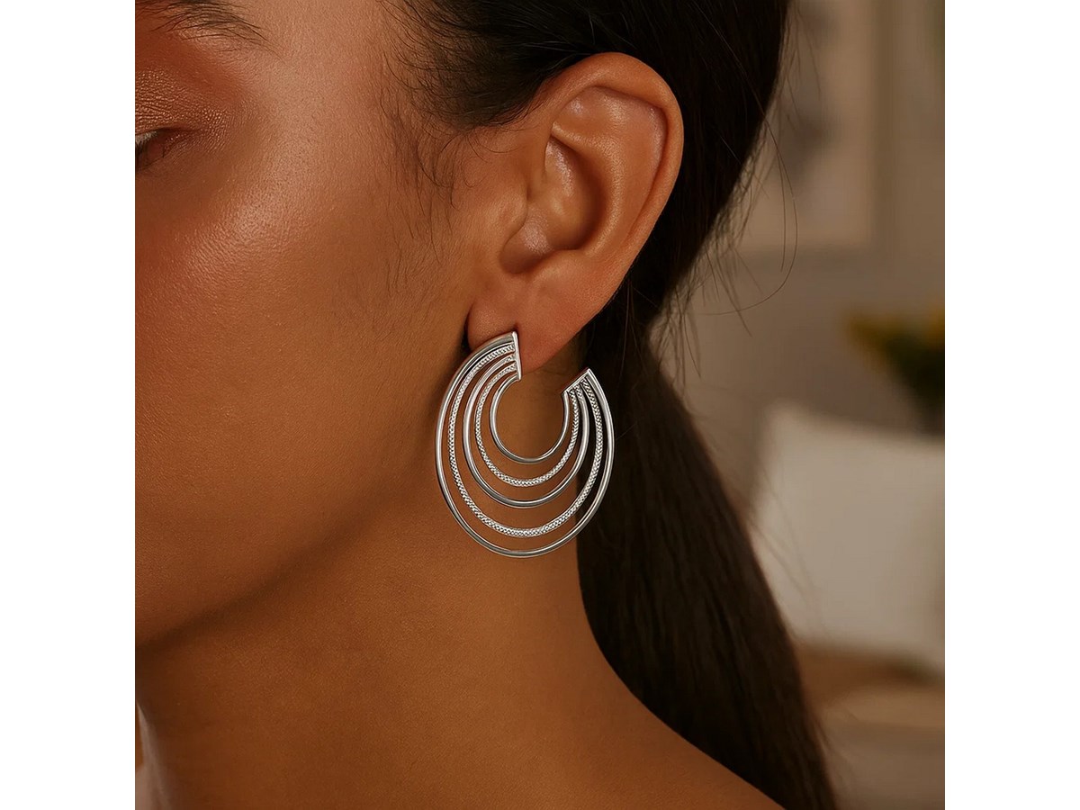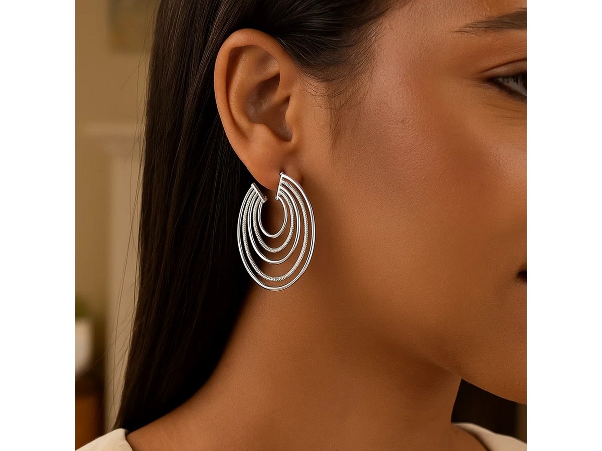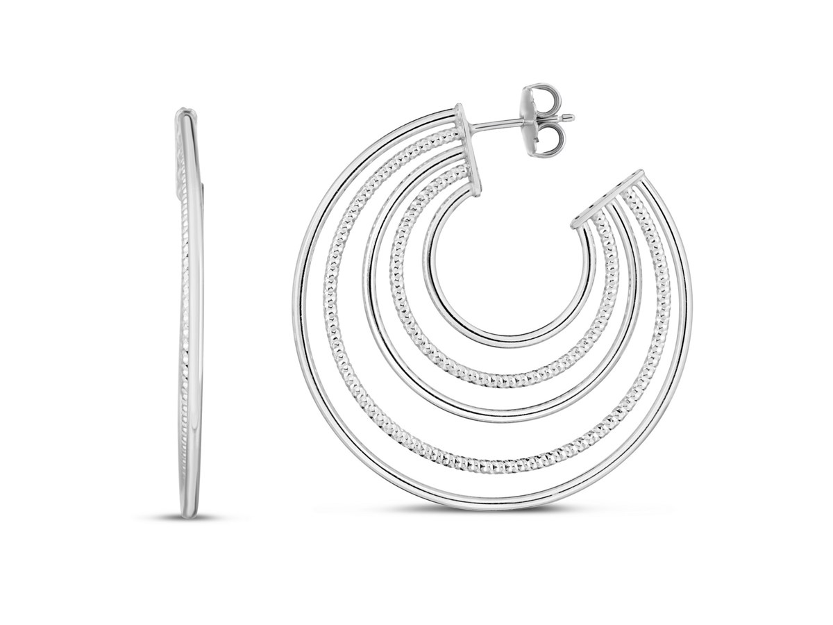 Elegant sterling silver diamond-cut and polished five row hoop earrings featuring a radiant layered design. The diamond-cut detailing enhances brilliance, while the polished finish adds timeless sophistication, making these hoops a perfect choice for both everyday elegance and special occasions.