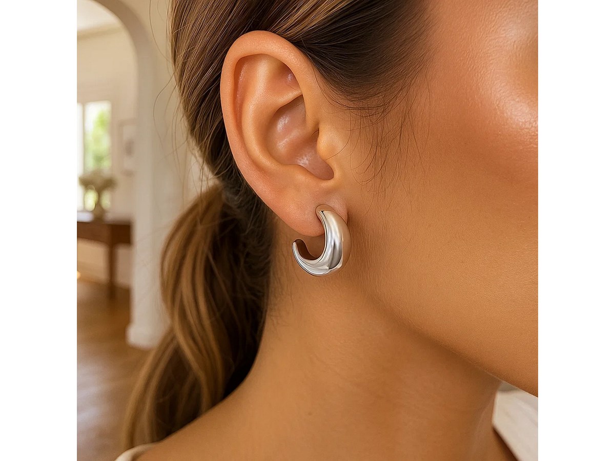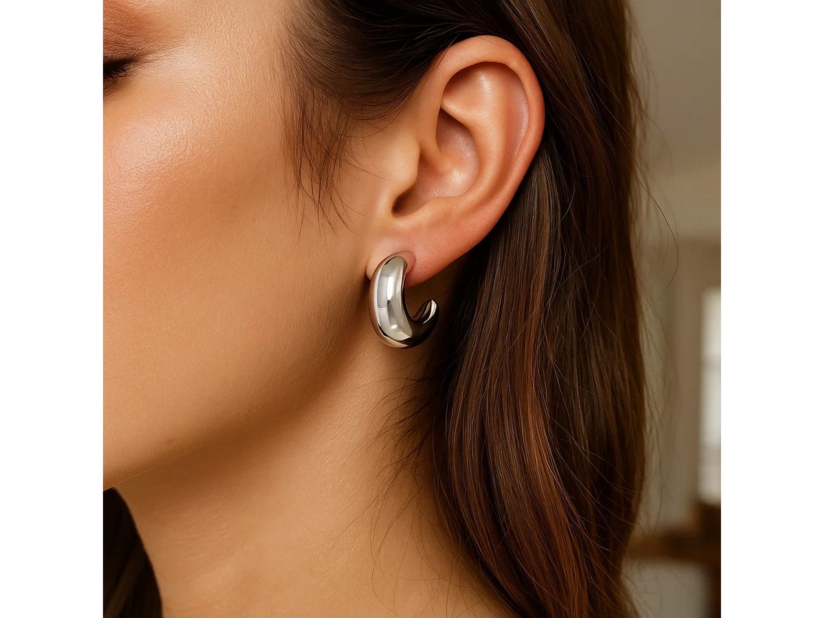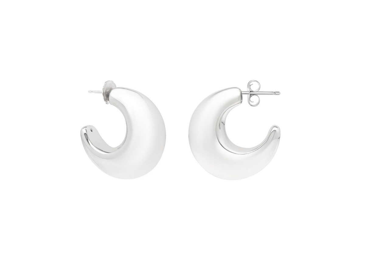 Stylish sterling silver half moon hoop earrings featuring a polished finish and smooth curved design. The half moon silhouette adds a modern touch to a classic style, creating a sleek and versatile look perfect for both everyday wear and special occasions.