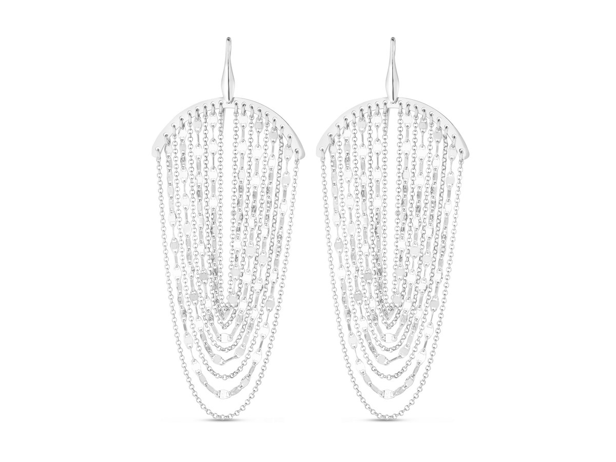Stunning sterling silver multi strand chain drop chandelier earrings featuring cascading polished chains that create graceful movement and shine. The elegant layered design adds drama and sophistication, perfect for elevating any evening or special occasion look.