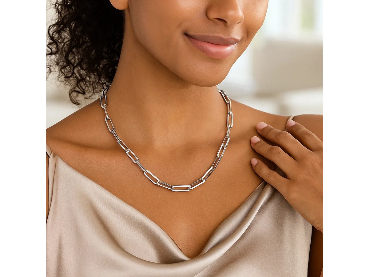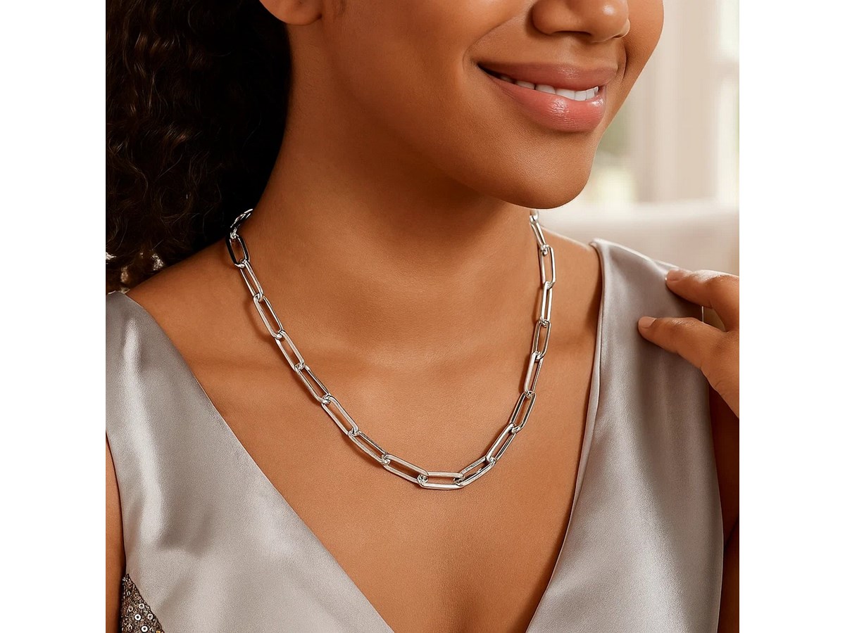 Destined to become a classic, the polish of classic sterling silver meets the modern intrigue of paperclip chain in this beautiful necklace. Necklace is 18 and 38 inches long, 5.9mm wide, and closes with a lobster clasp.