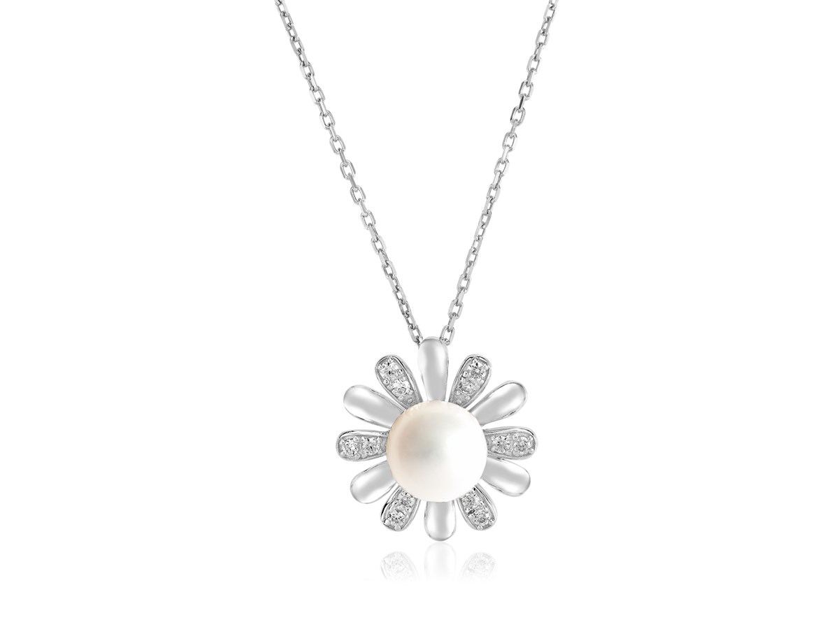 A textured starburst of sterling silver encircles a gorgeous round white pearl in this exquisite pendant. Pendant is 18 inches long and closes with a lobster clasp.