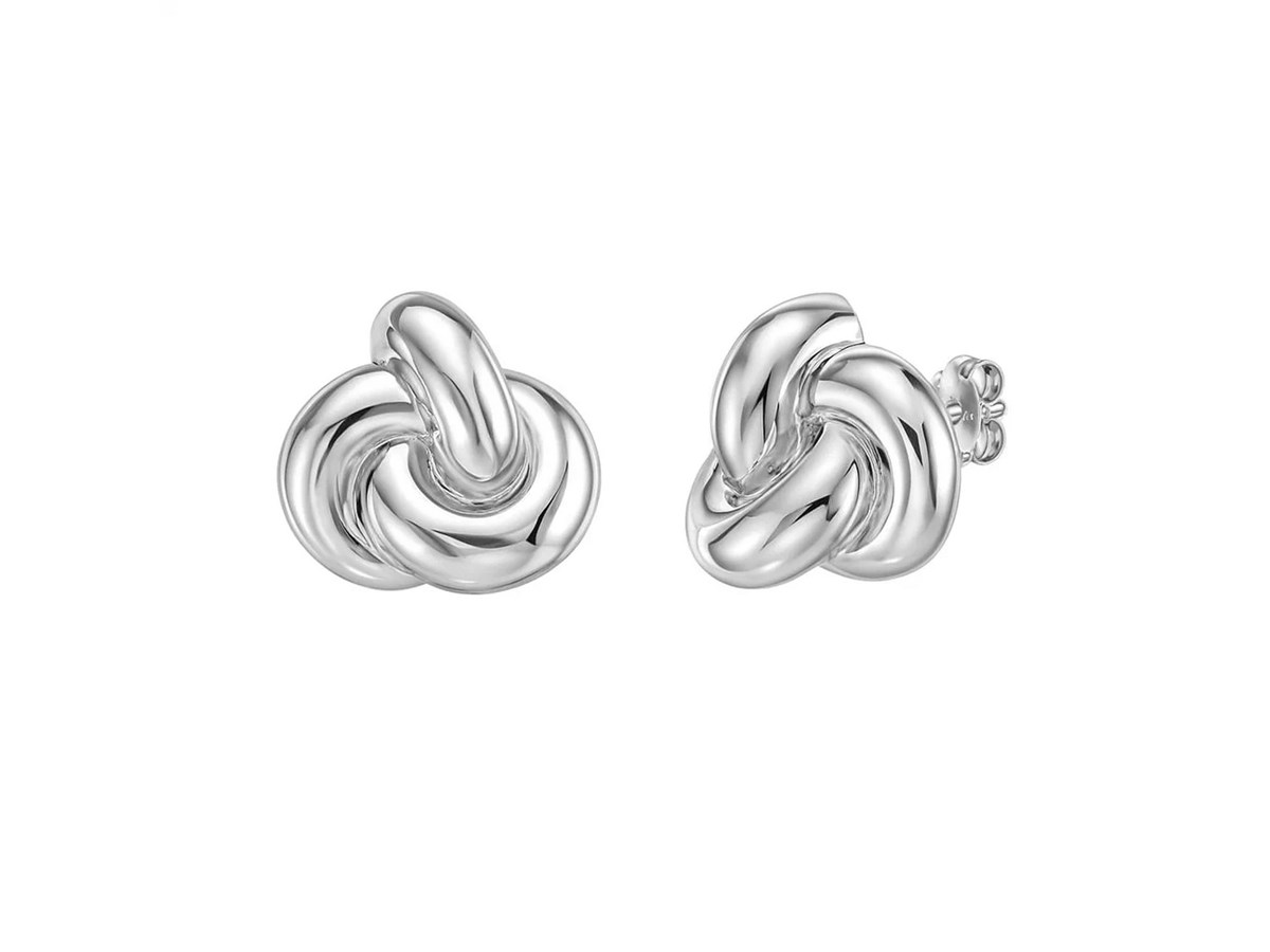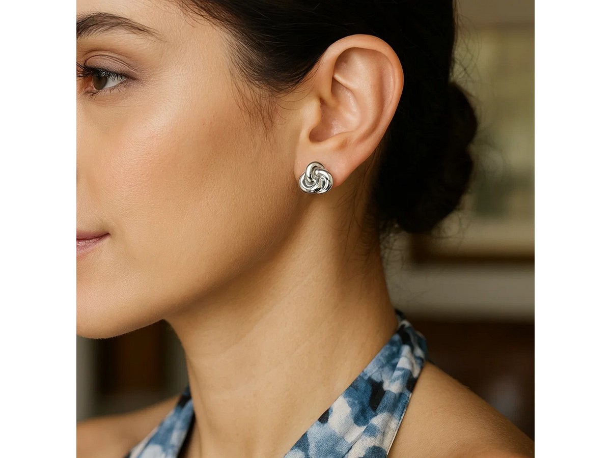 Elegant sterling silver puffed love knot stud earrings featuring an intertwined design symbolizing unity and affection. The puffed, polished finish adds depth and shine, creating a timeless and sophisticated look perfect for any occasion.