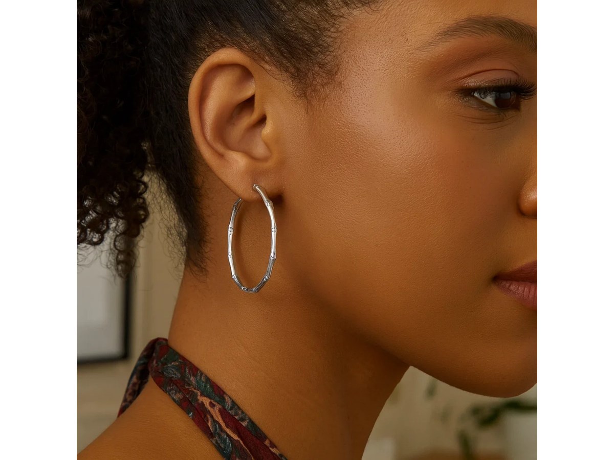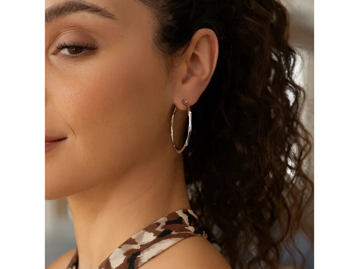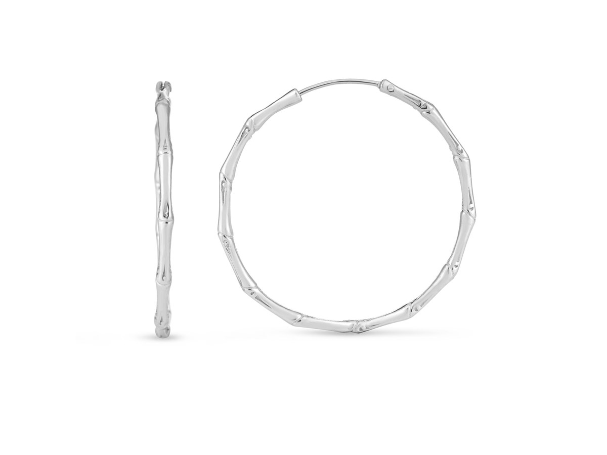 Elegant sterling silver rhodium plated bamboo hoop earrings featuring a sleek, nature-inspired design with subtle texture and a high-polish finish. The bamboo pattern adds organic charm, while the rhodium plating enhances brilliance for a timeless, refined look.
