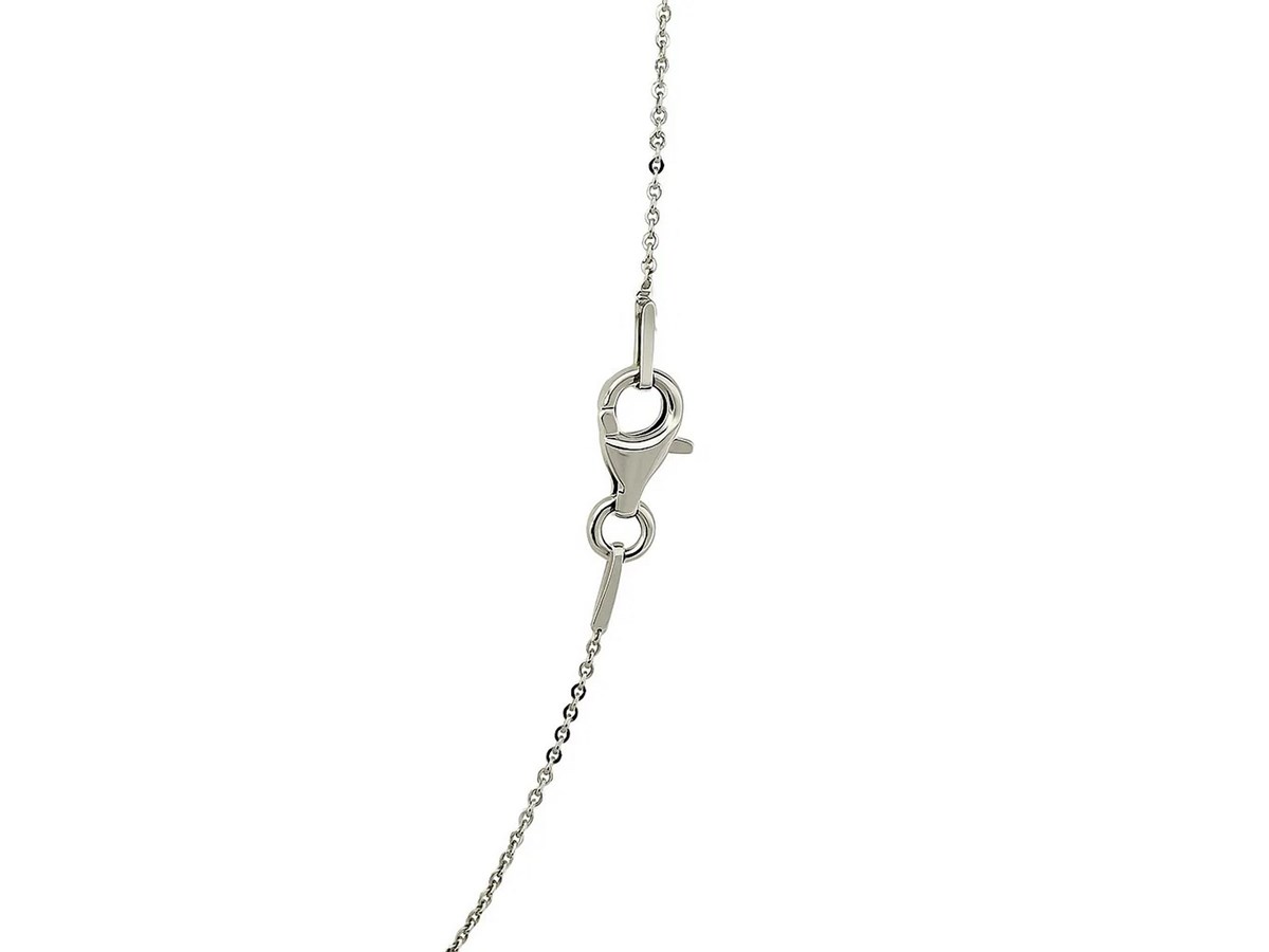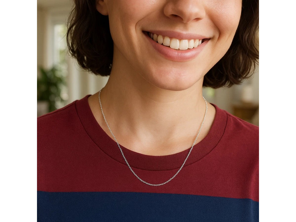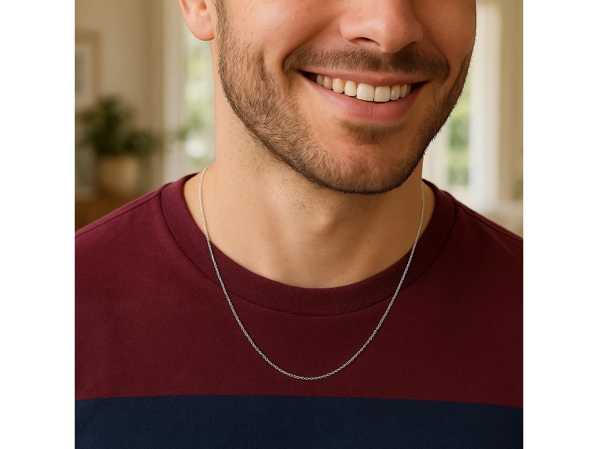 Rhodium plated cable chain crafted in sterling silver measuring 0.60 millimeters in width. Available in lengths 16 inches, 18 inches and 20 inches.
