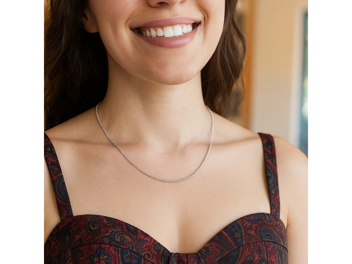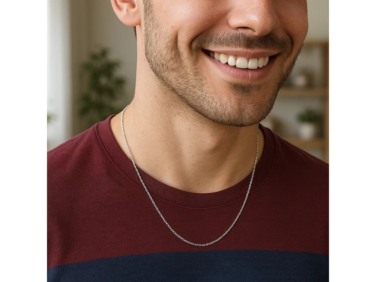 Rhodium plated cable chain crafted in sterling silver measuring 0.80 millimeters in width. Available in lengths 16 inches,  18 inches and 20 inches.
