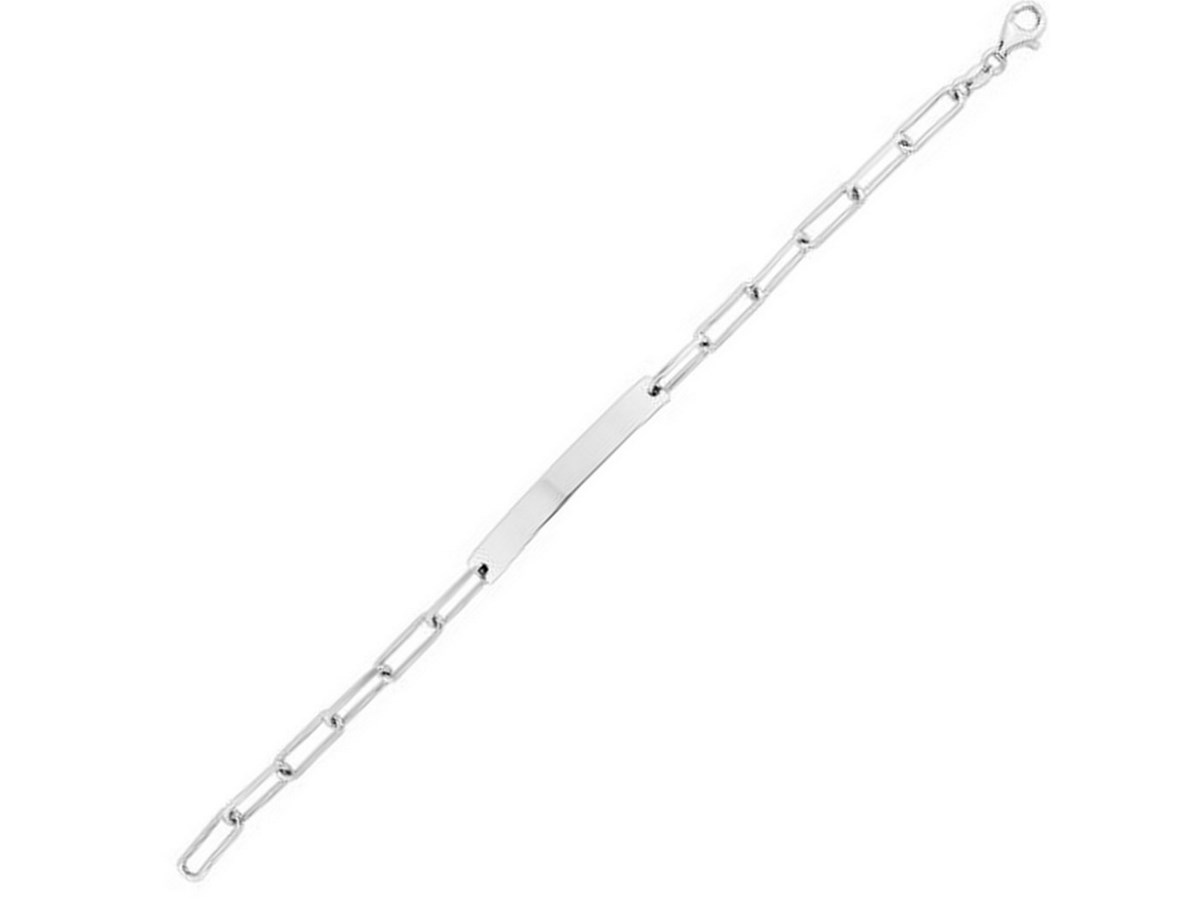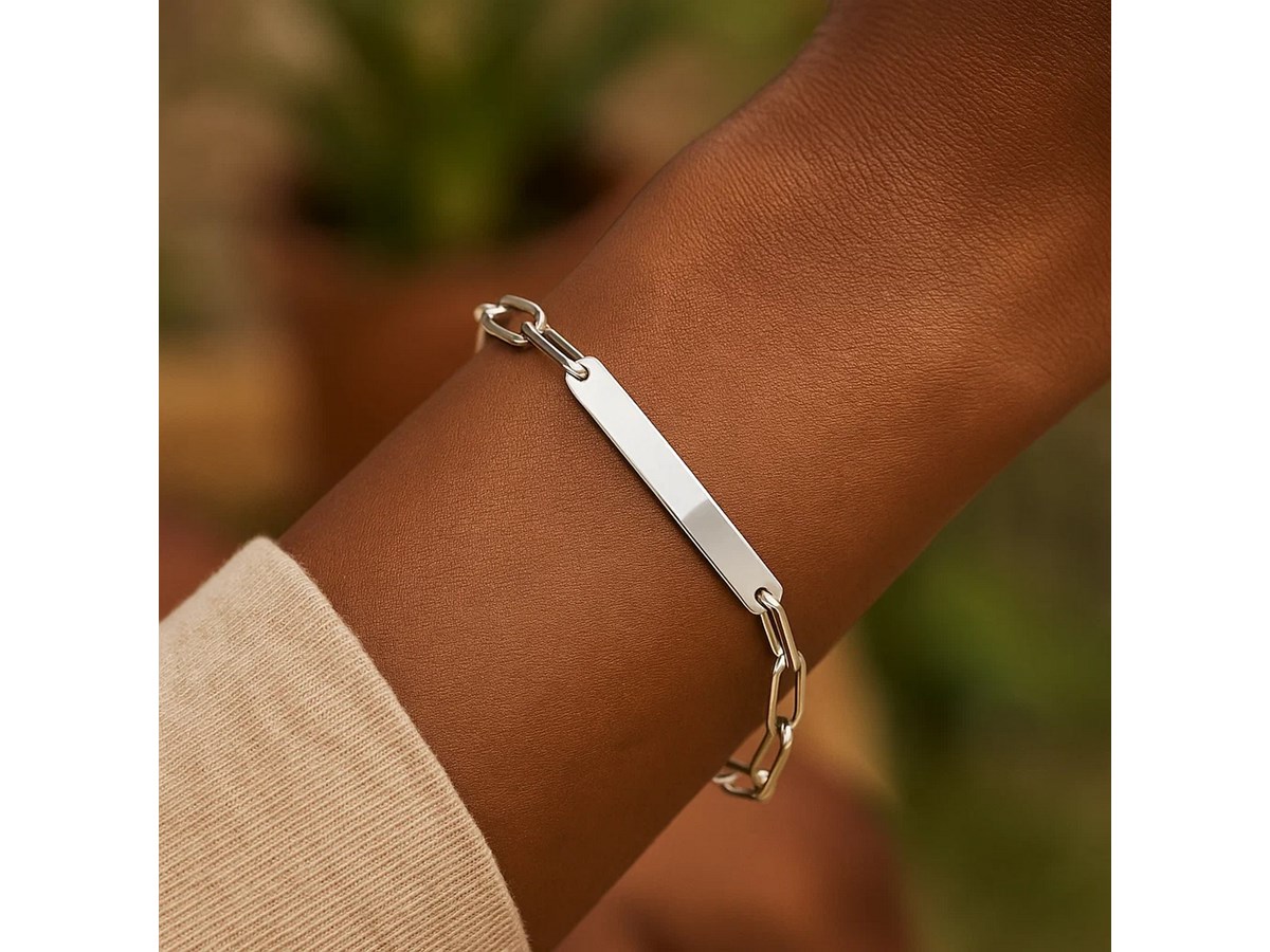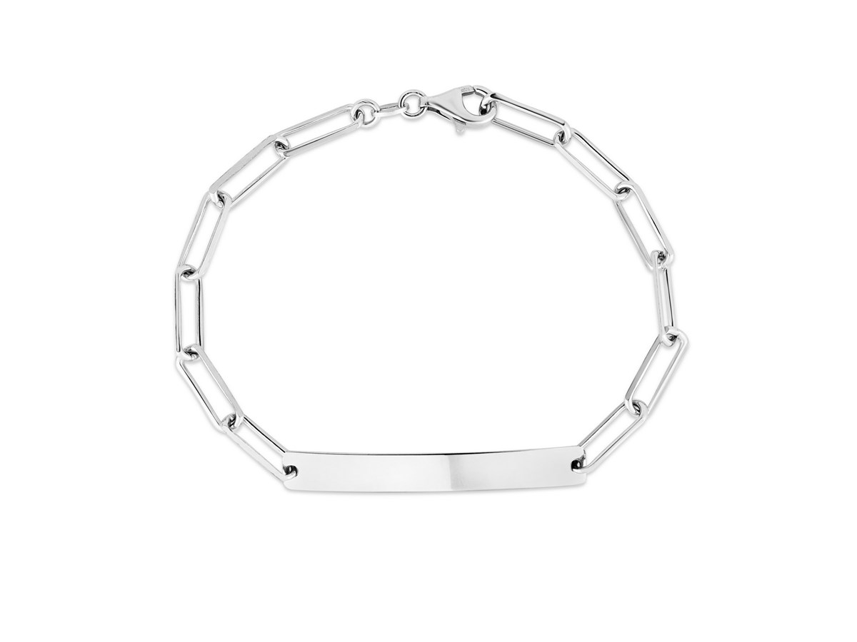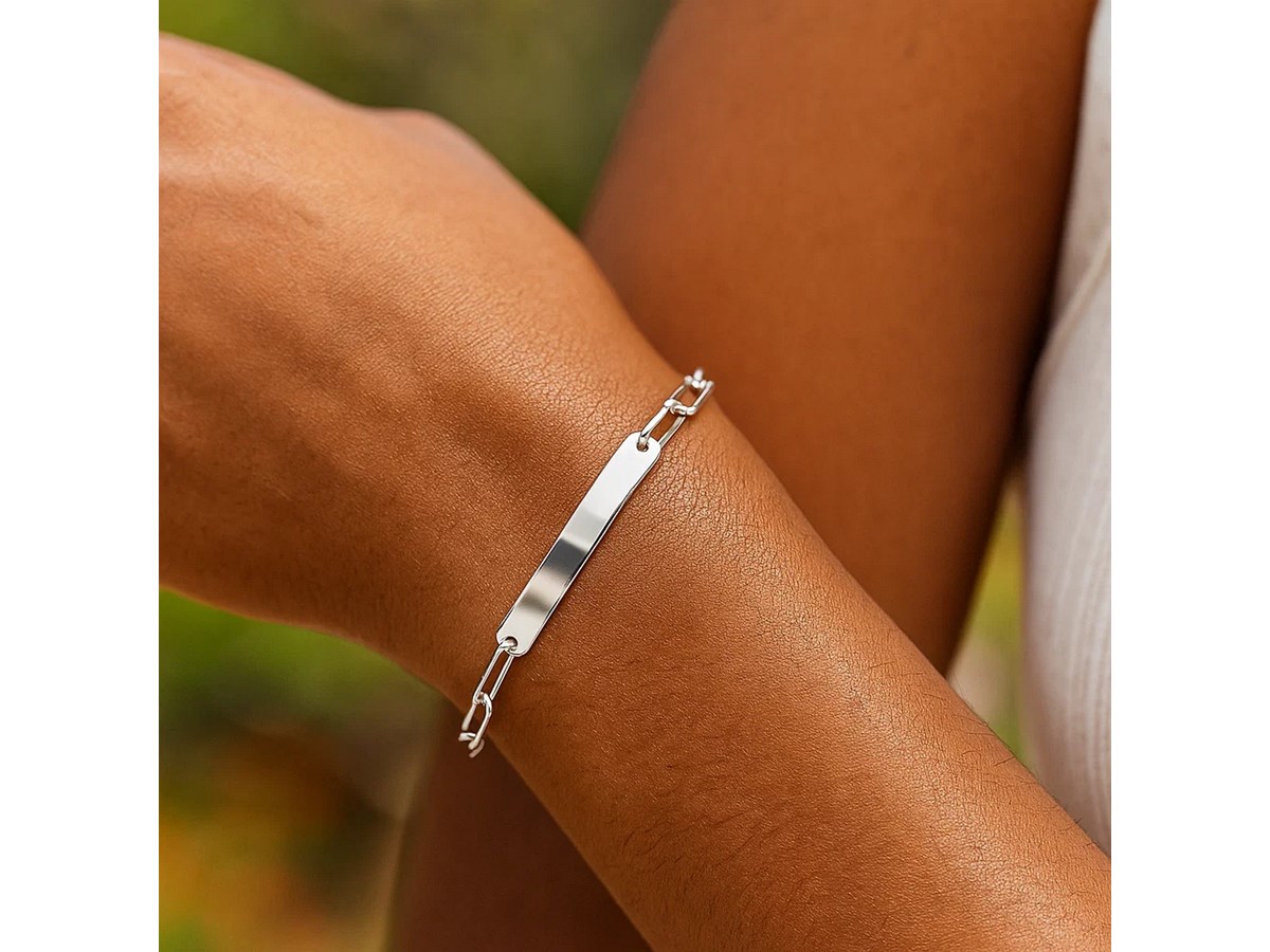 This sterling silver rhodium plated ID bar paperclip bracelet (2.10 mm) features a sleek engravable bar on a modern link chain. Its bright polished finish and clean design make it perfect for personalization, everyday wear, or meaningful gifting.
