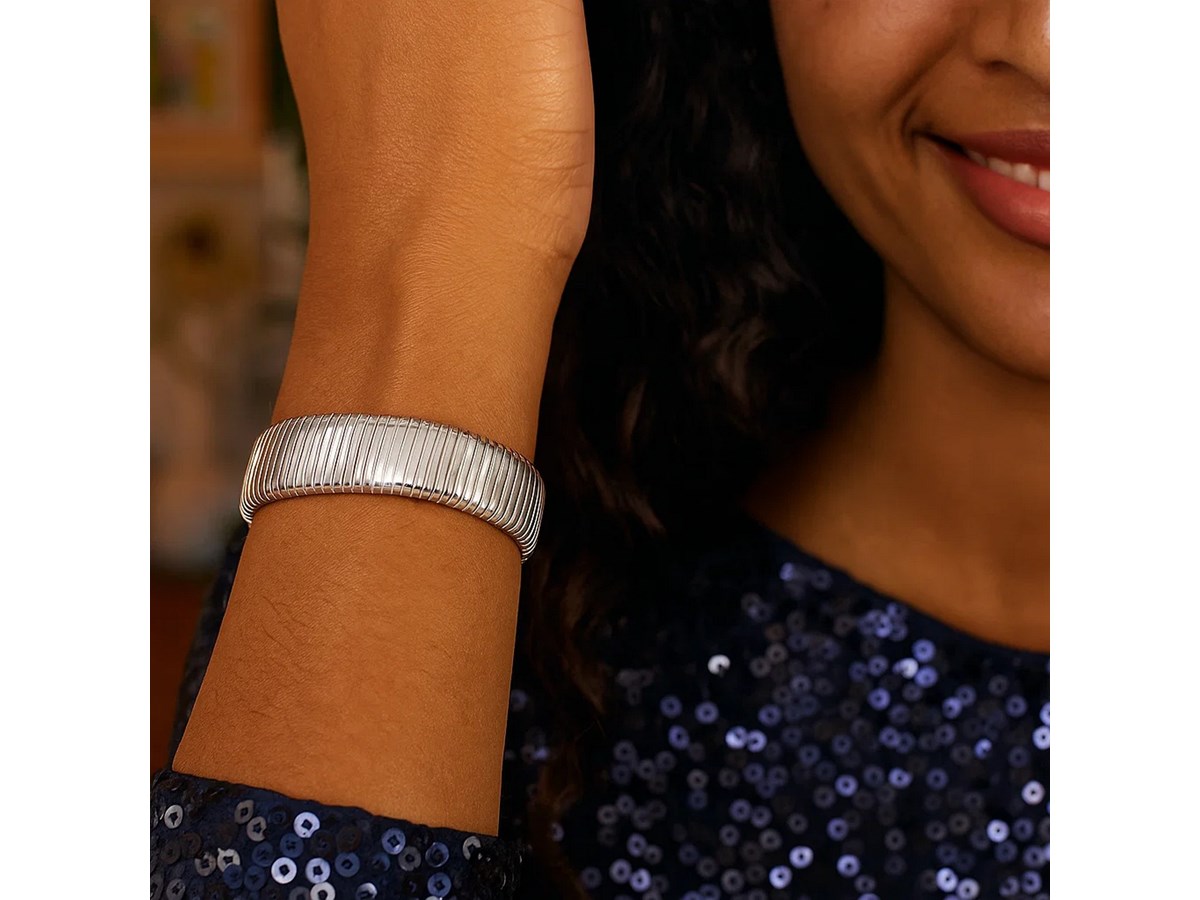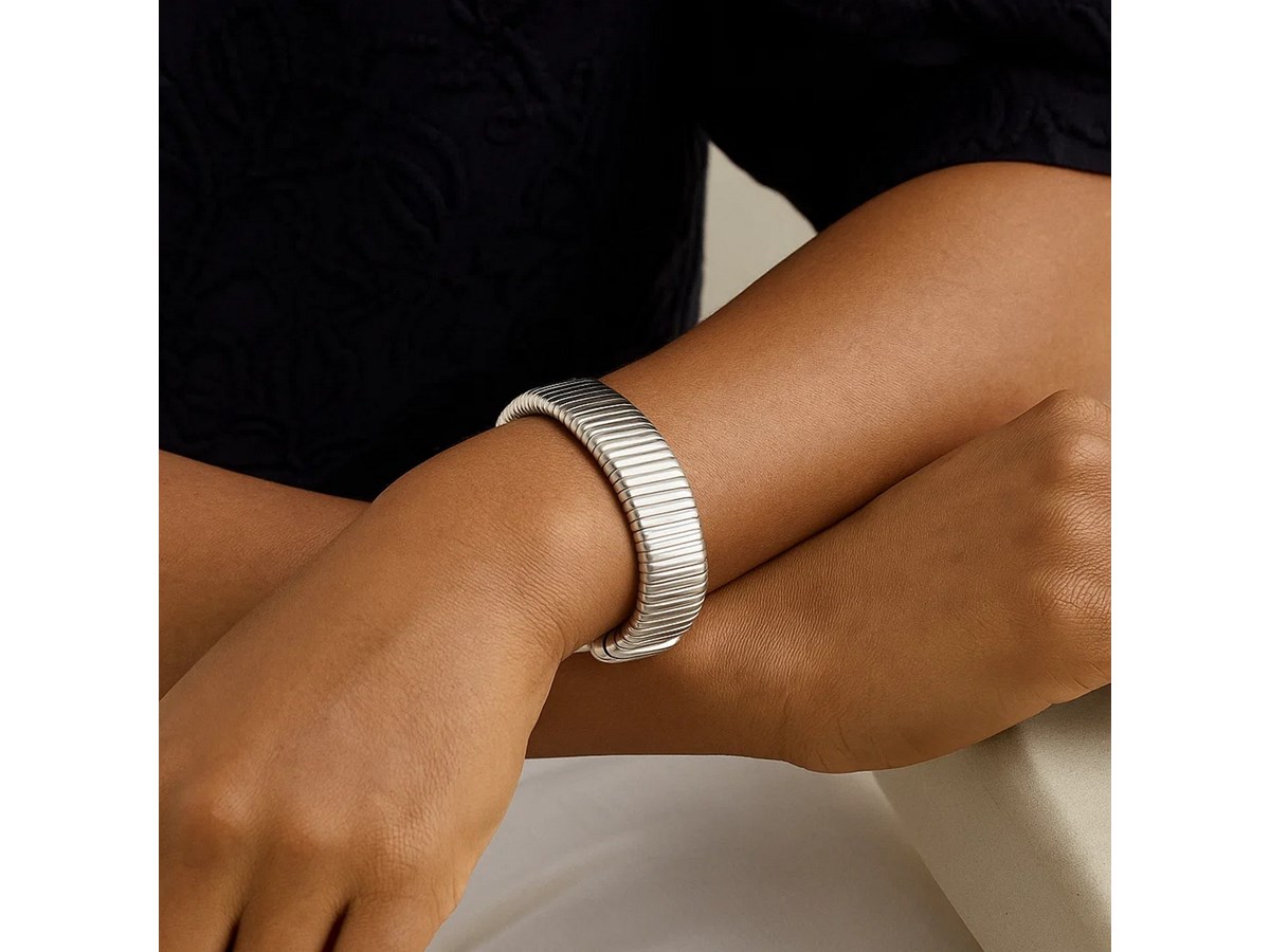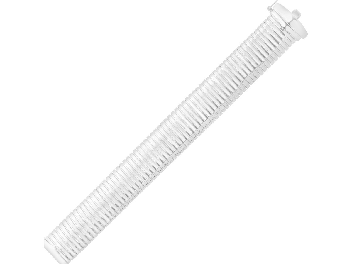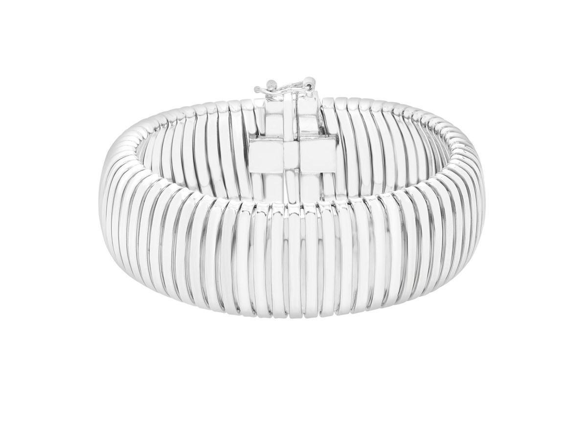 This sterling silver rhodium plated Tubogas bracelet (18.00 mm) features an ultra-wide, flexible coil design with a sleek, polished finish. Its extra-thick profile delivers bold, modern shine, making it a luxurious statement piece for any jewelry collection.