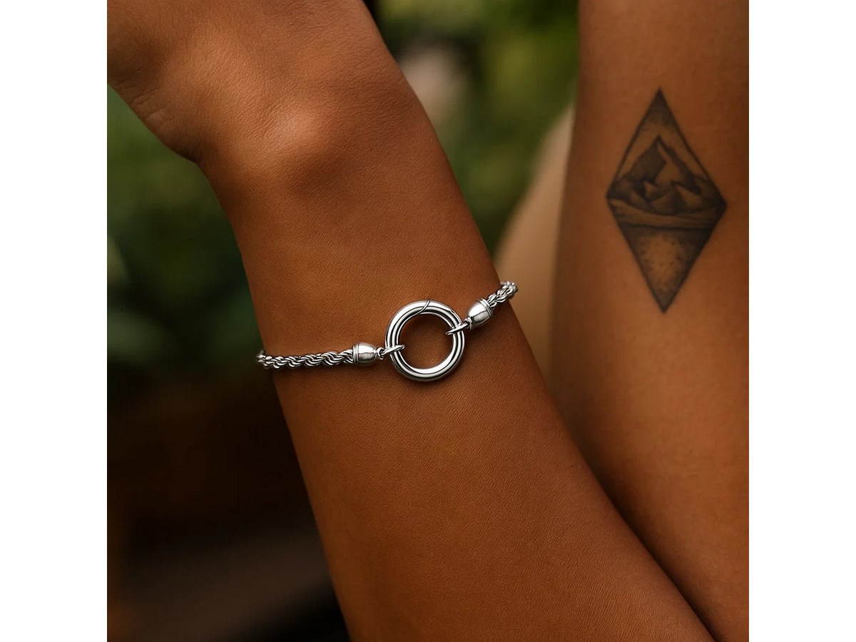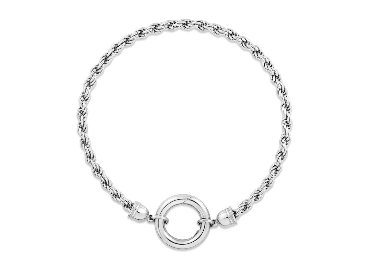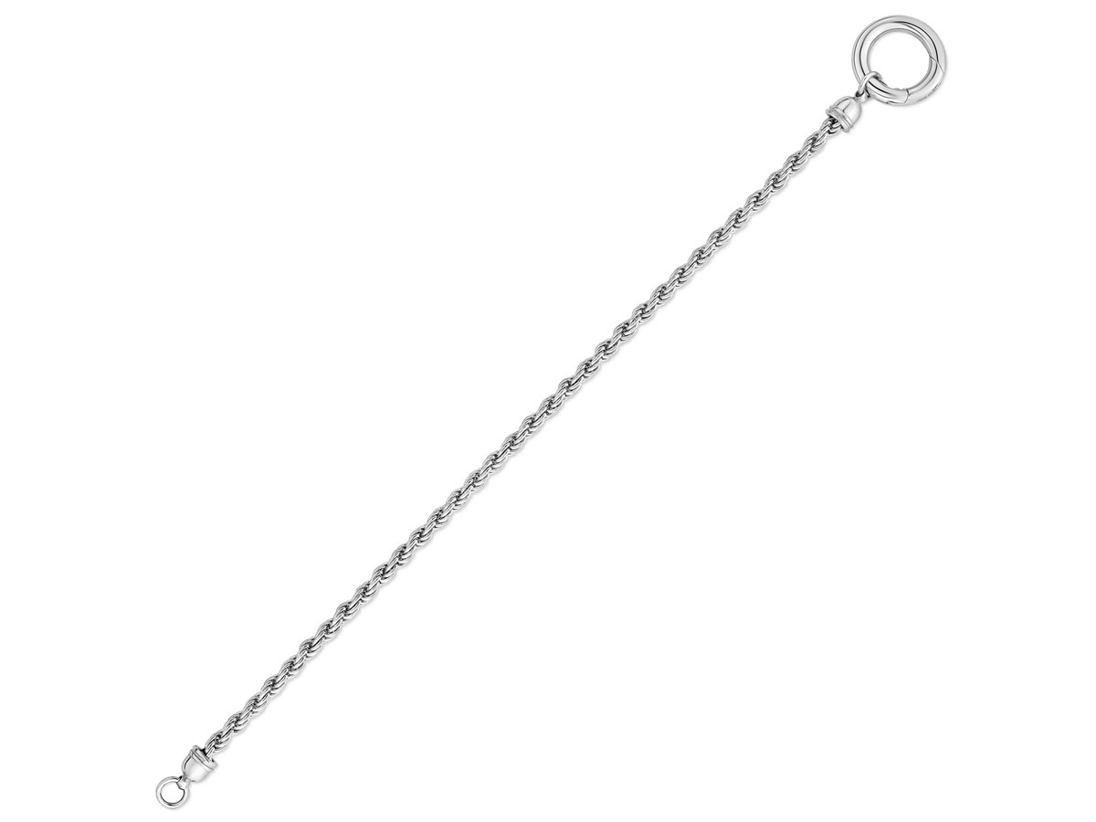 This sterling silver rhodium plated rope chain bracelet (3.40 mm) features a polished fancy push-lock clasp for a secure, stylish finish. Its bright shine and textured rope design make it a modern standout, perfect for everyday wear or layering.
