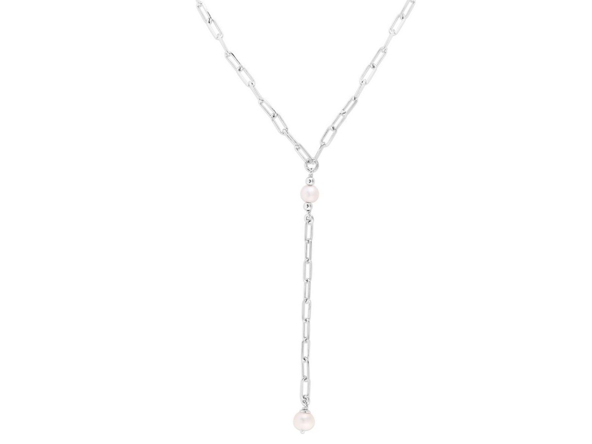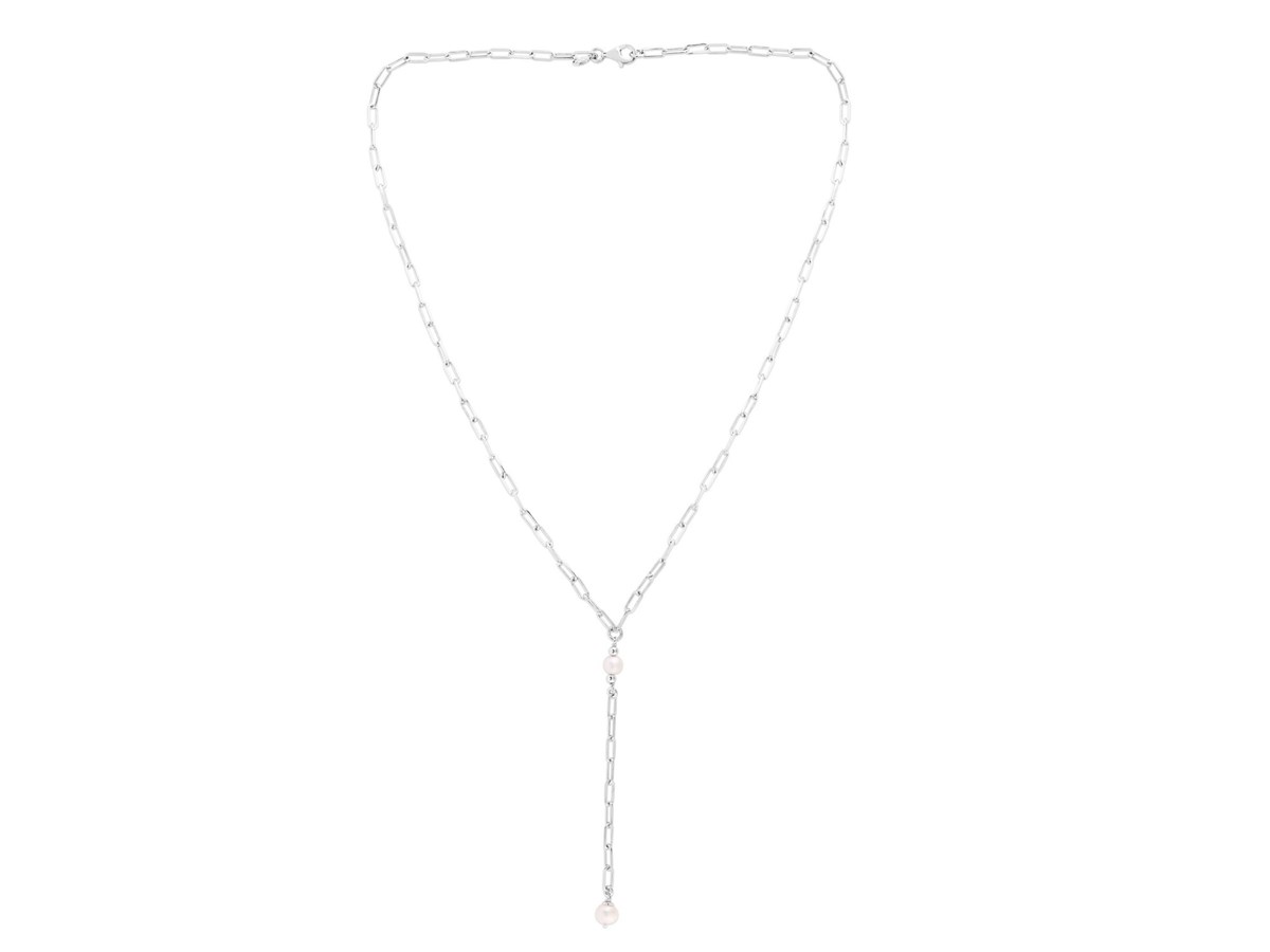 This lariat necklace combines a modern rhodium-plated sterling silver paperclip chain with the timeless beauty of freshwater pearls. Its graceful, adjustable drop creates an elegant silhouette that adds effortless sophistication to any outfit.