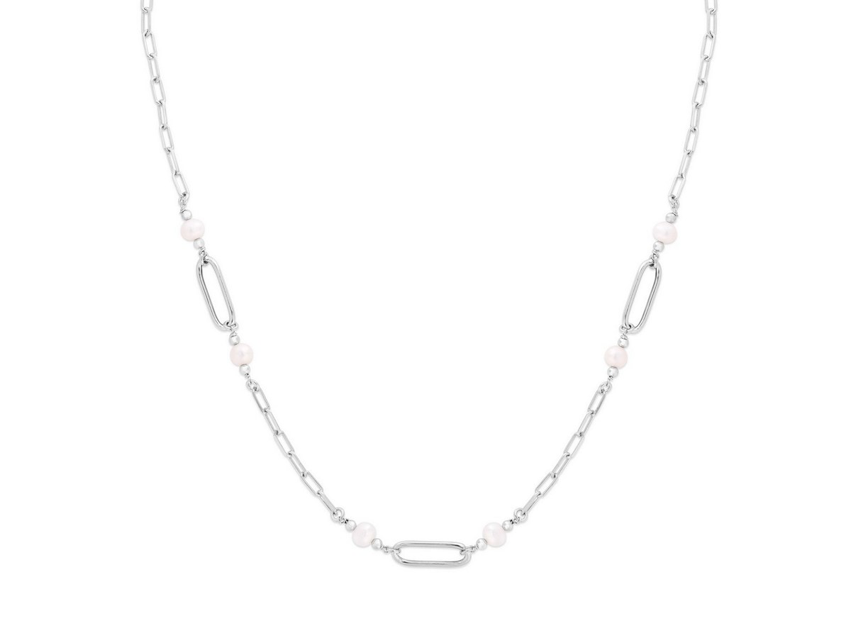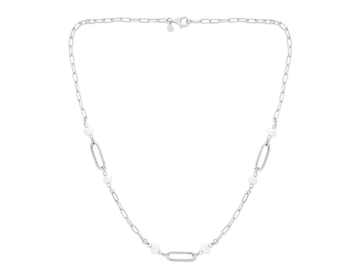 This necklace pairs a modern rhodium-plated sterling silver paperclip chain with the timeless beauty of freshwater pearls, creating a refined and contemporary look perfect for everyday elegance.