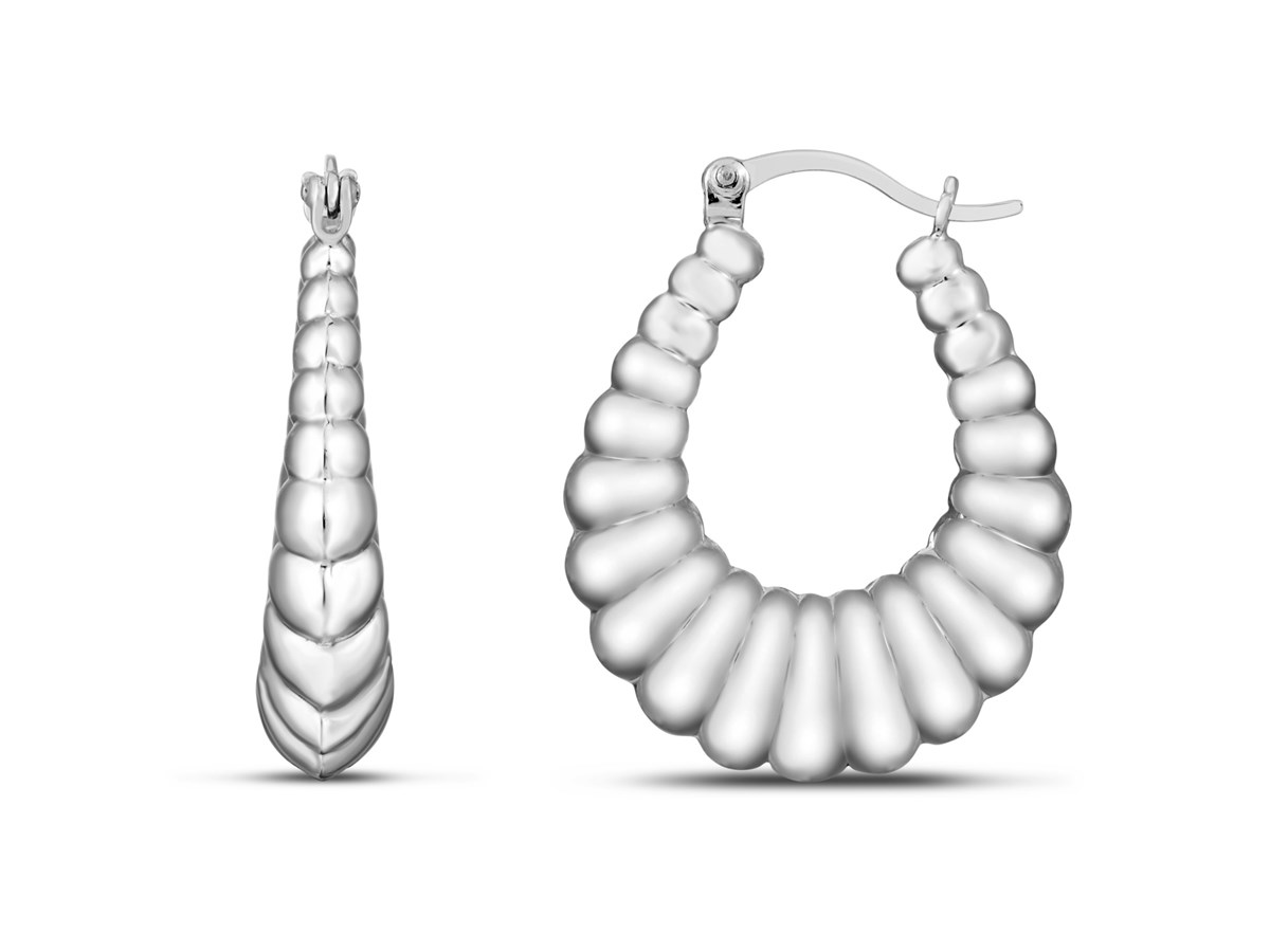 Elegant sterling silver rhodium plated graduated ribbed hoop earrings featuring a smooth, polished finish and gently tapered design. The ribbed texture adds depth and dimension, while the rhodium plating enhances brilliance for a timeless, sophisticated look.