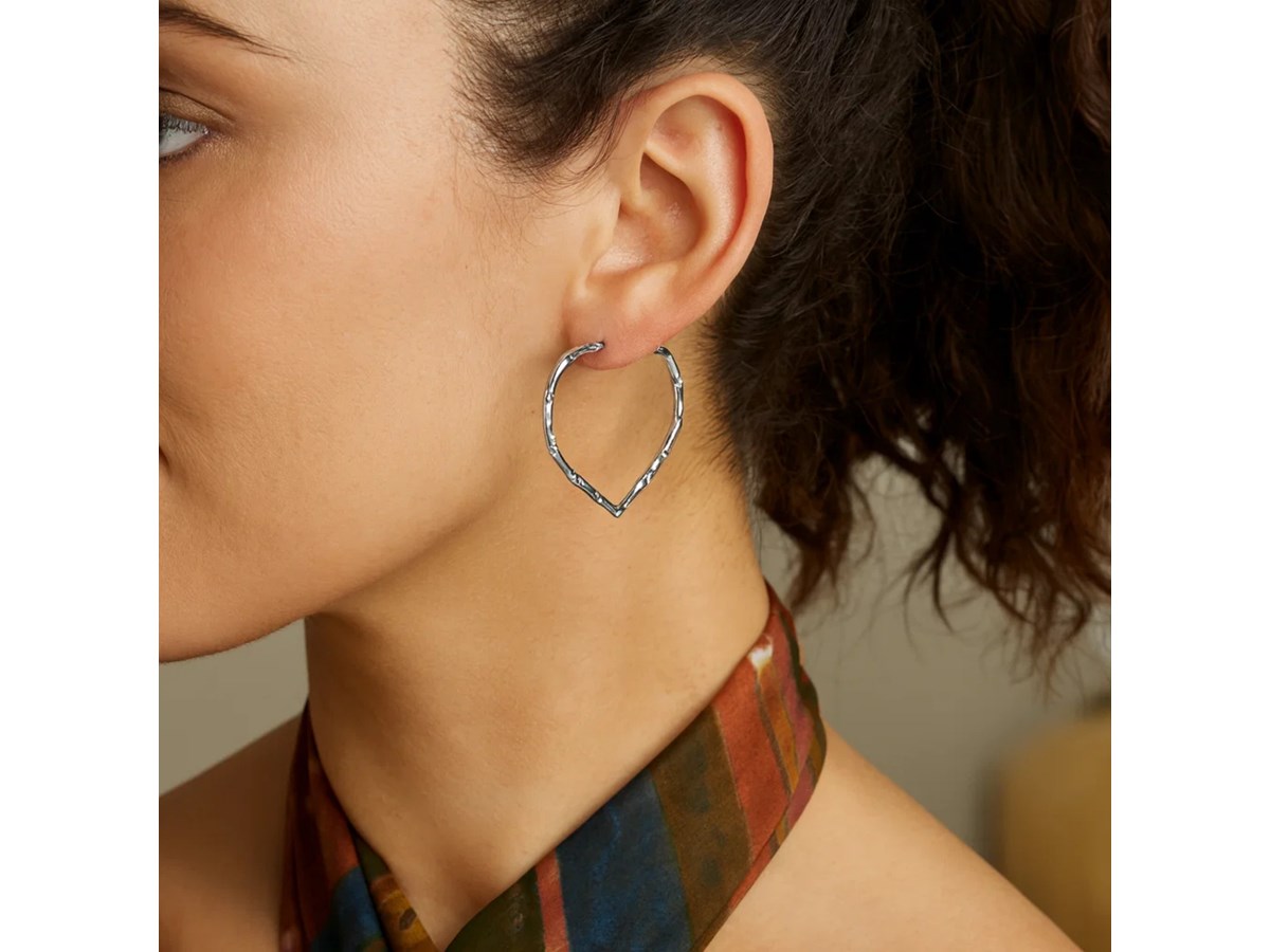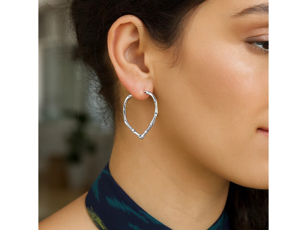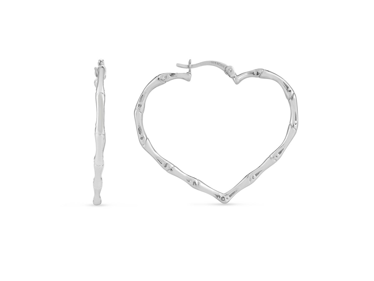 Charming sterling silver rhodium plated heart bamboo hoop earrings featuring a unique heart-shaped silhouette with a textured bamboo design. The polished rhodium finish adds lasting shine and elegance, creating a romantic yet modern statement for any occasion.