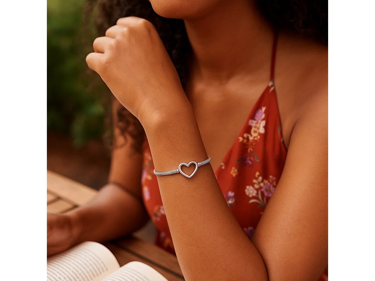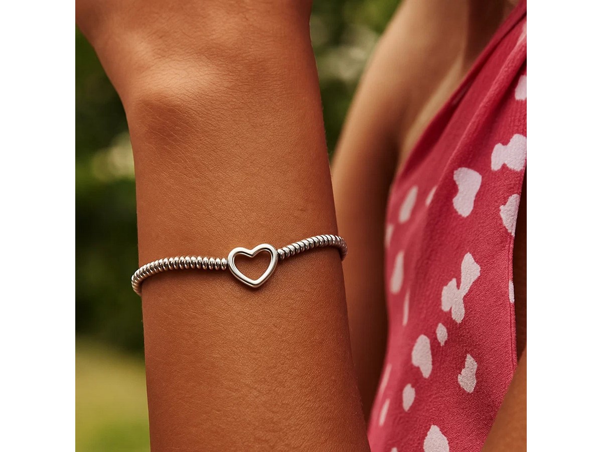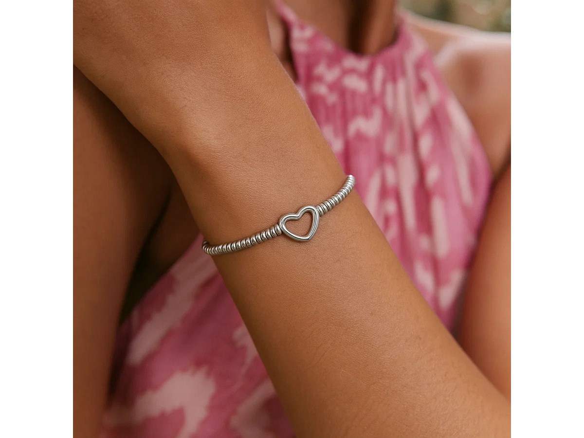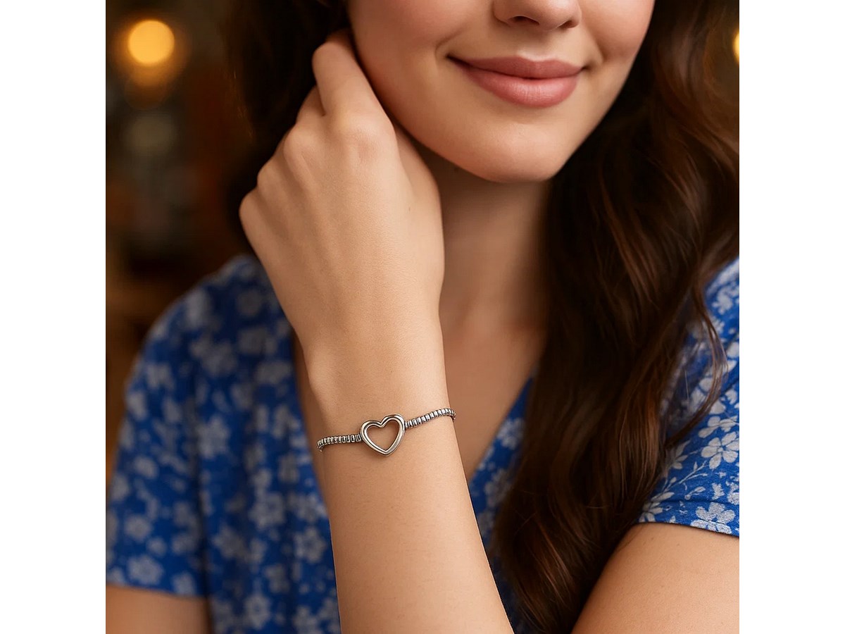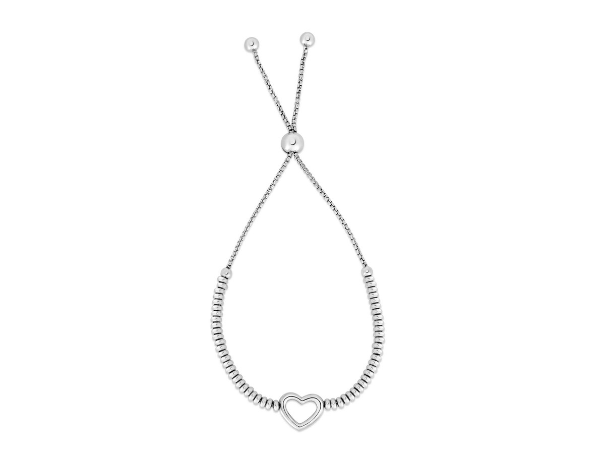 This sterling silver rhodium plated heart bead friendship bracelet features polished beads accented by a sweet heart charm on an adjustable drawstring chain. Its bright shine and meaningful design make it perfect for everyday wear, gifting, or layering.