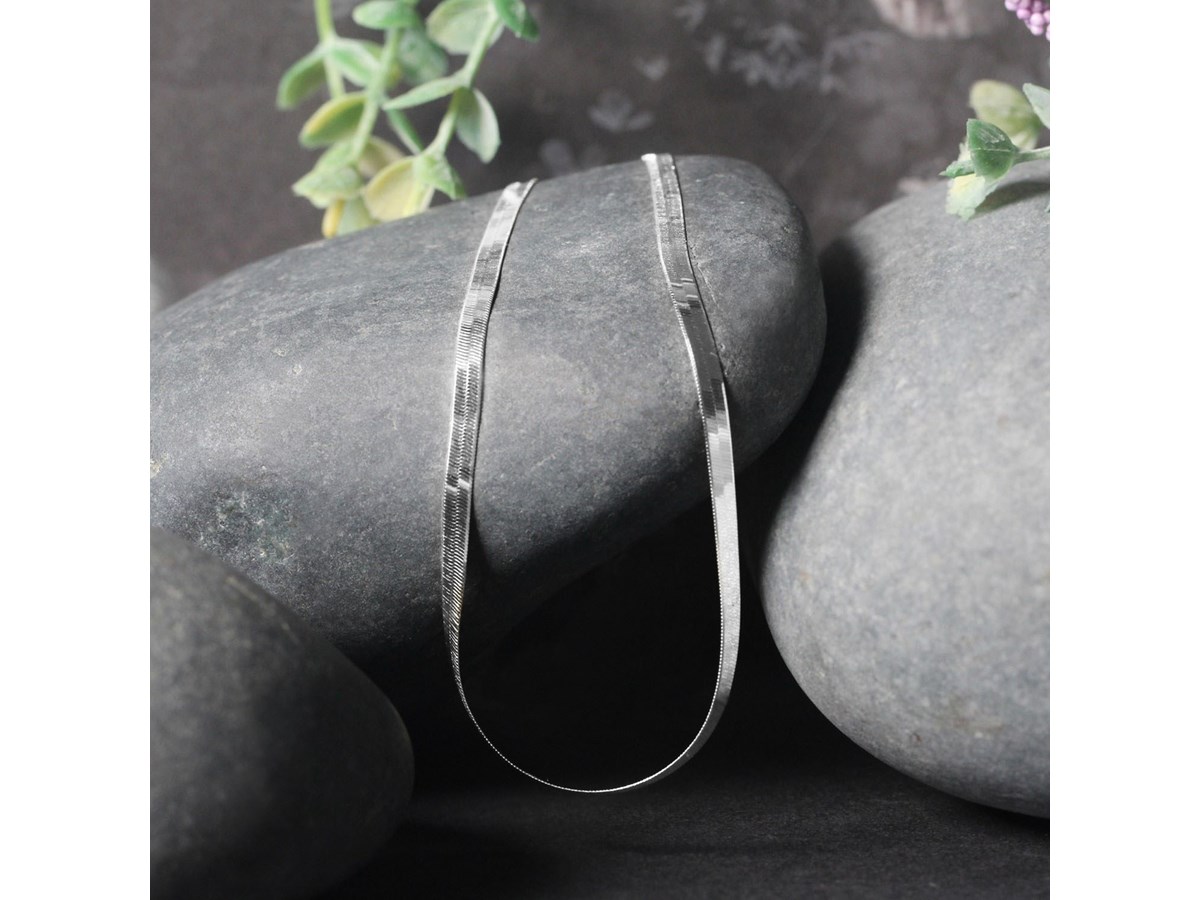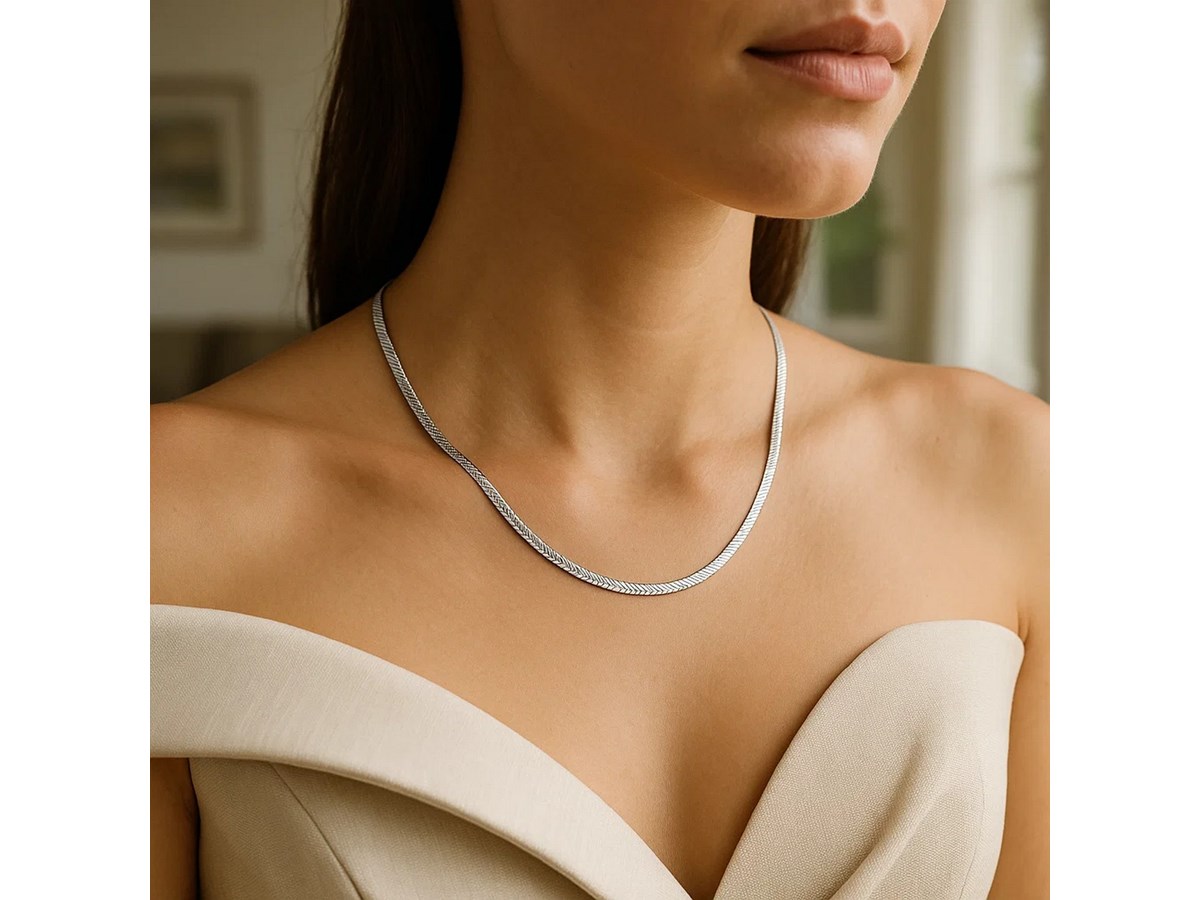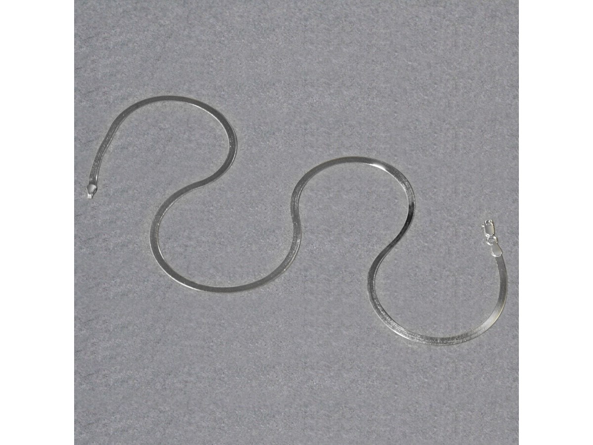 Rhodium plated herringbone chain crafted in sterling silver measuring 3.3 millimeters in width. Available in lengths 16 inches, 18 inches and 20 inches.
