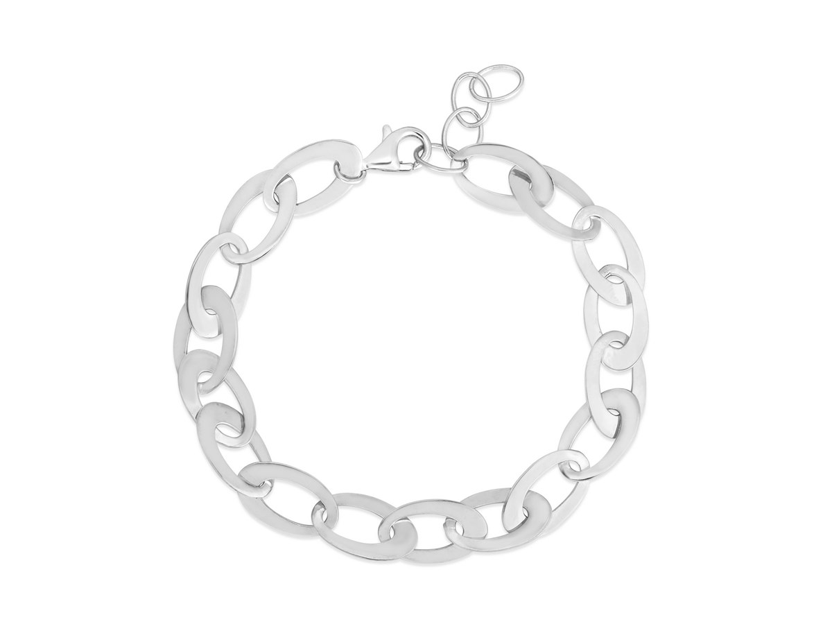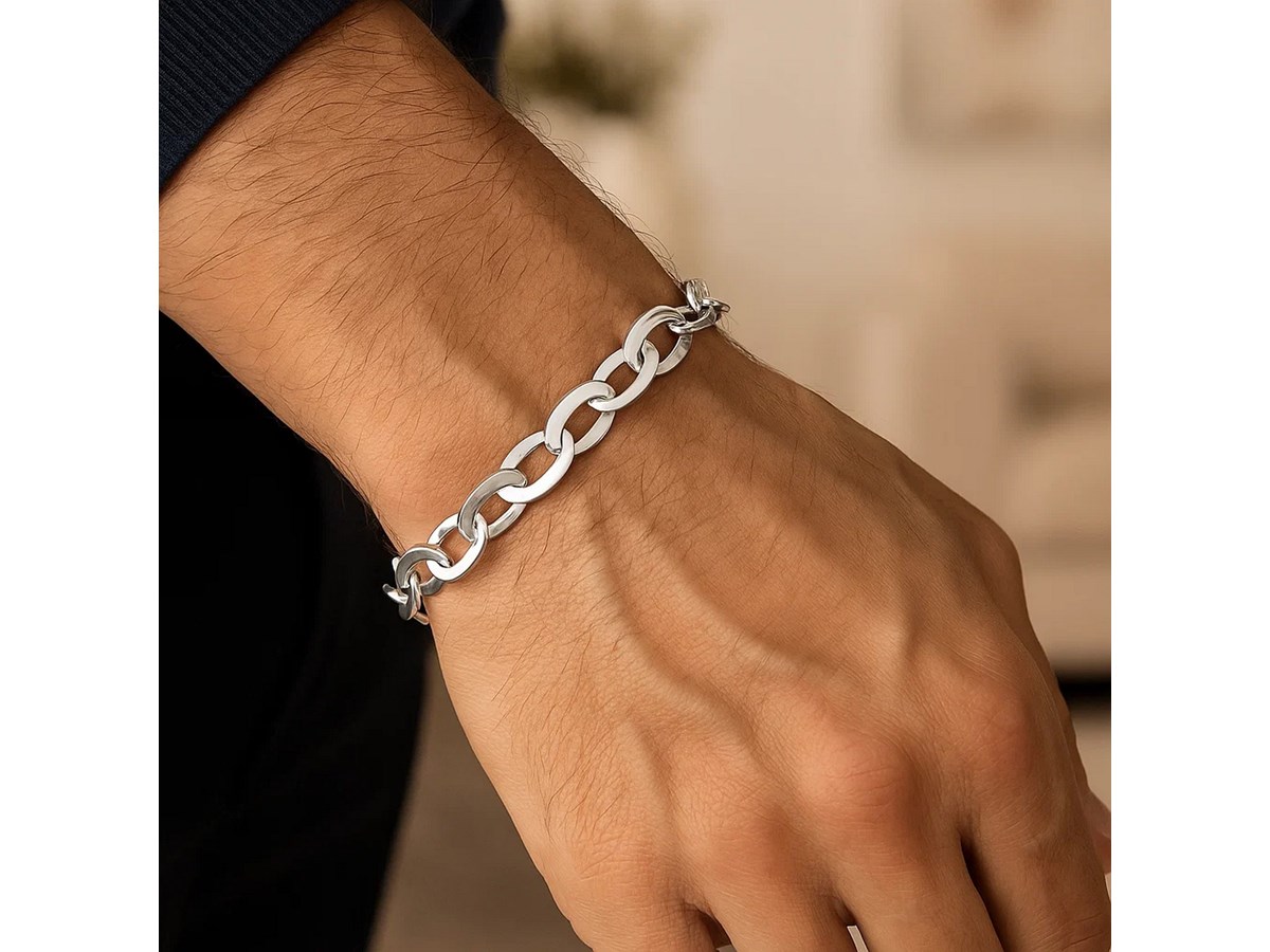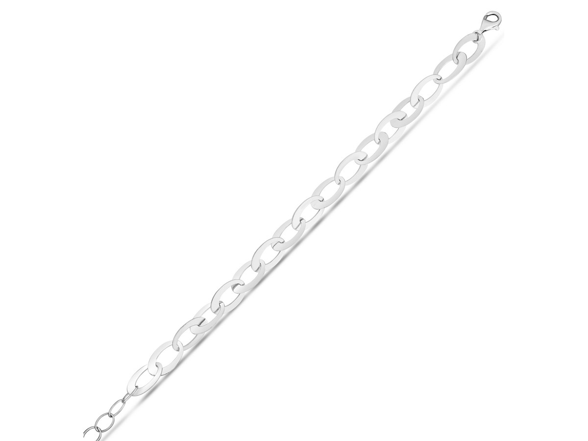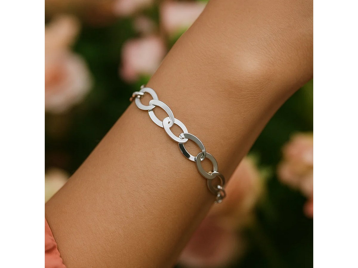 This sterling silver rhodium plated Italian oval link bracelet (8.70 mm) features bold, polished oval links with a sleek, high-shine finish. Its modern, eye-catching design makes it a standout piece, perfect for everyday style or layering with other favorites.