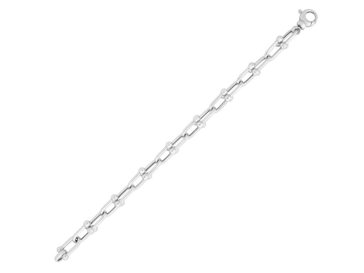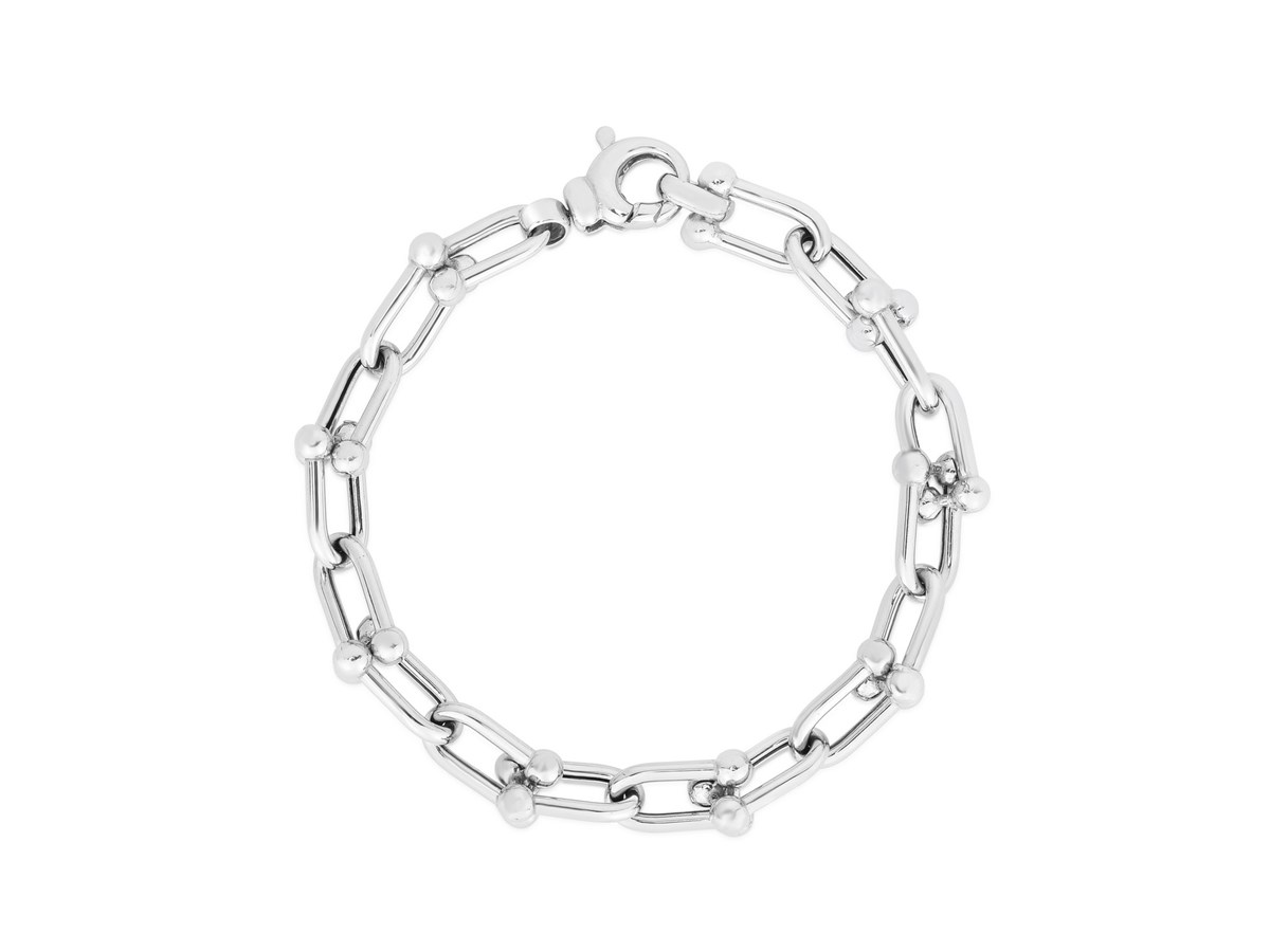 This sterling silver rhodium plated Jax link bead bracelet features bold, sculpted bead-style links with a bright polished finish. Its modern, dimensional design makes it a standout piece perfect for everyday wear, layering, or gifting.