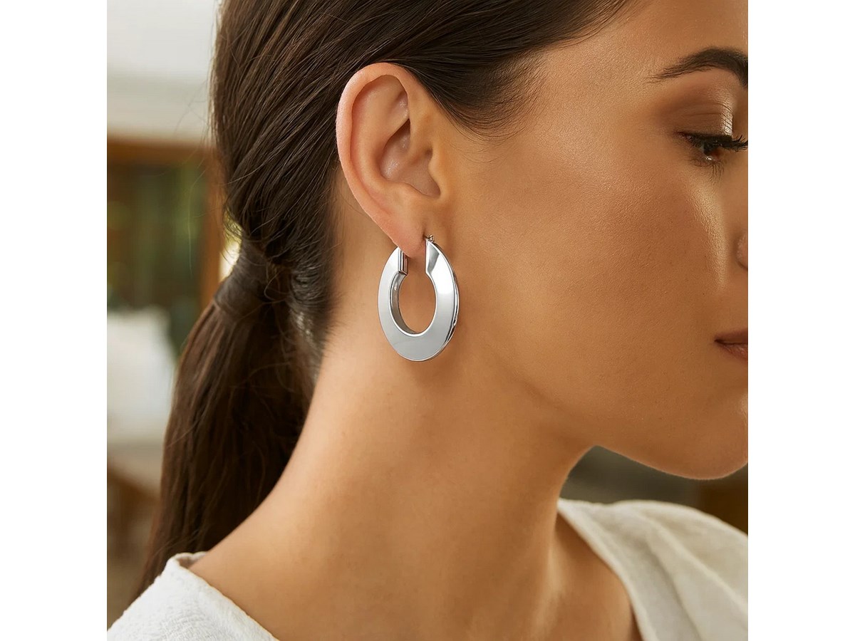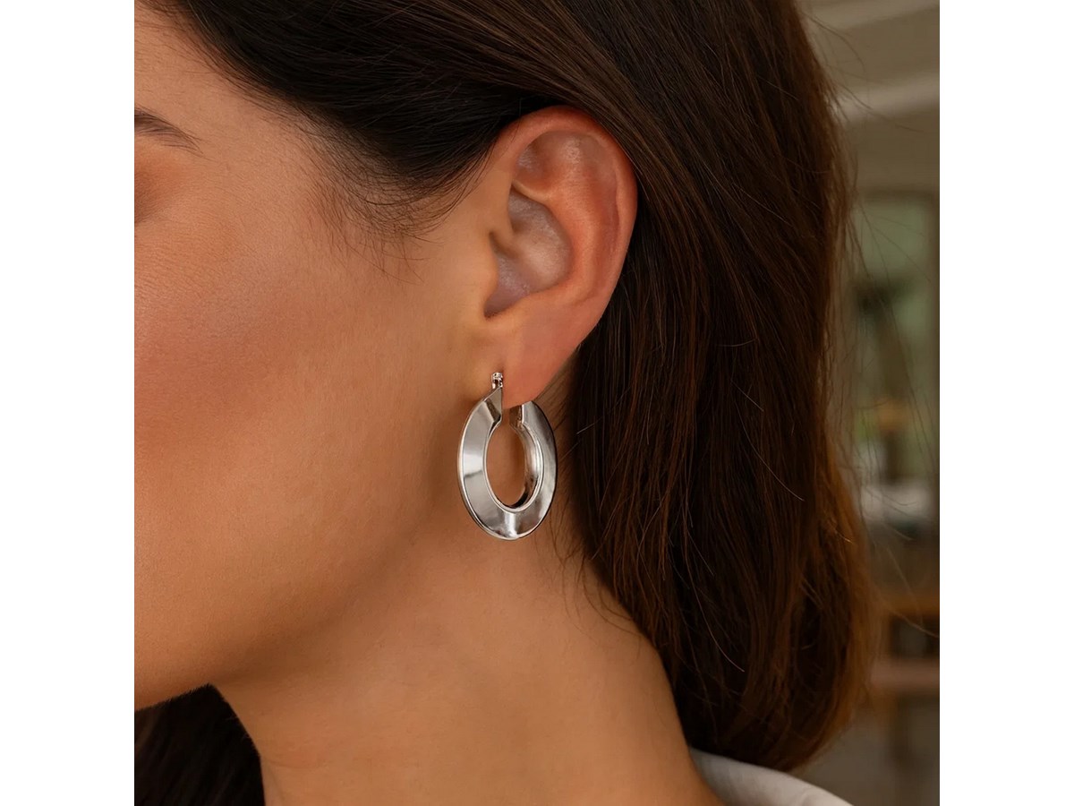 Bold sterling silver rhodium plated large puffed hoop earrings featuring a smooth, rounded design with a brilliant polished finish. The puffed silhouette adds volume and shine, while the rhodium plating enhances durability and timeless elegance.