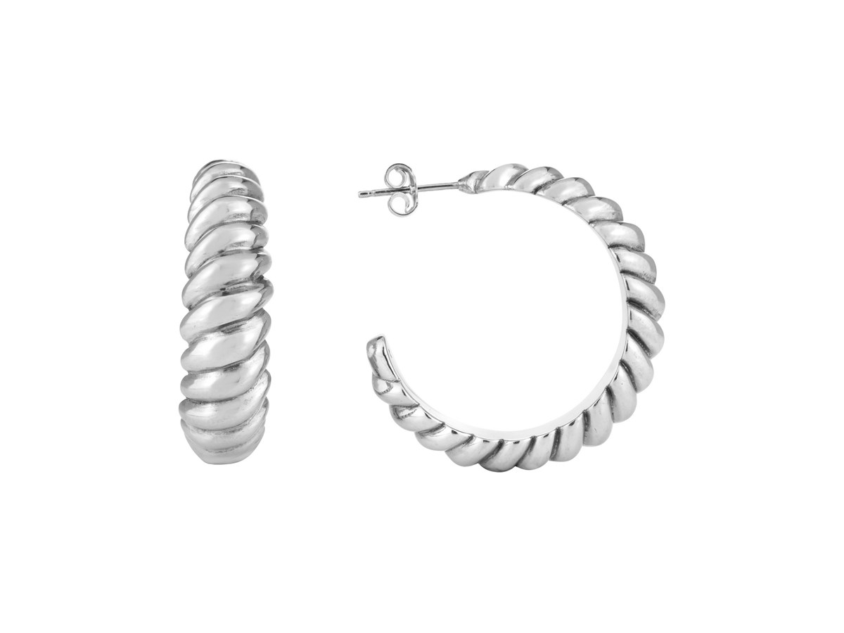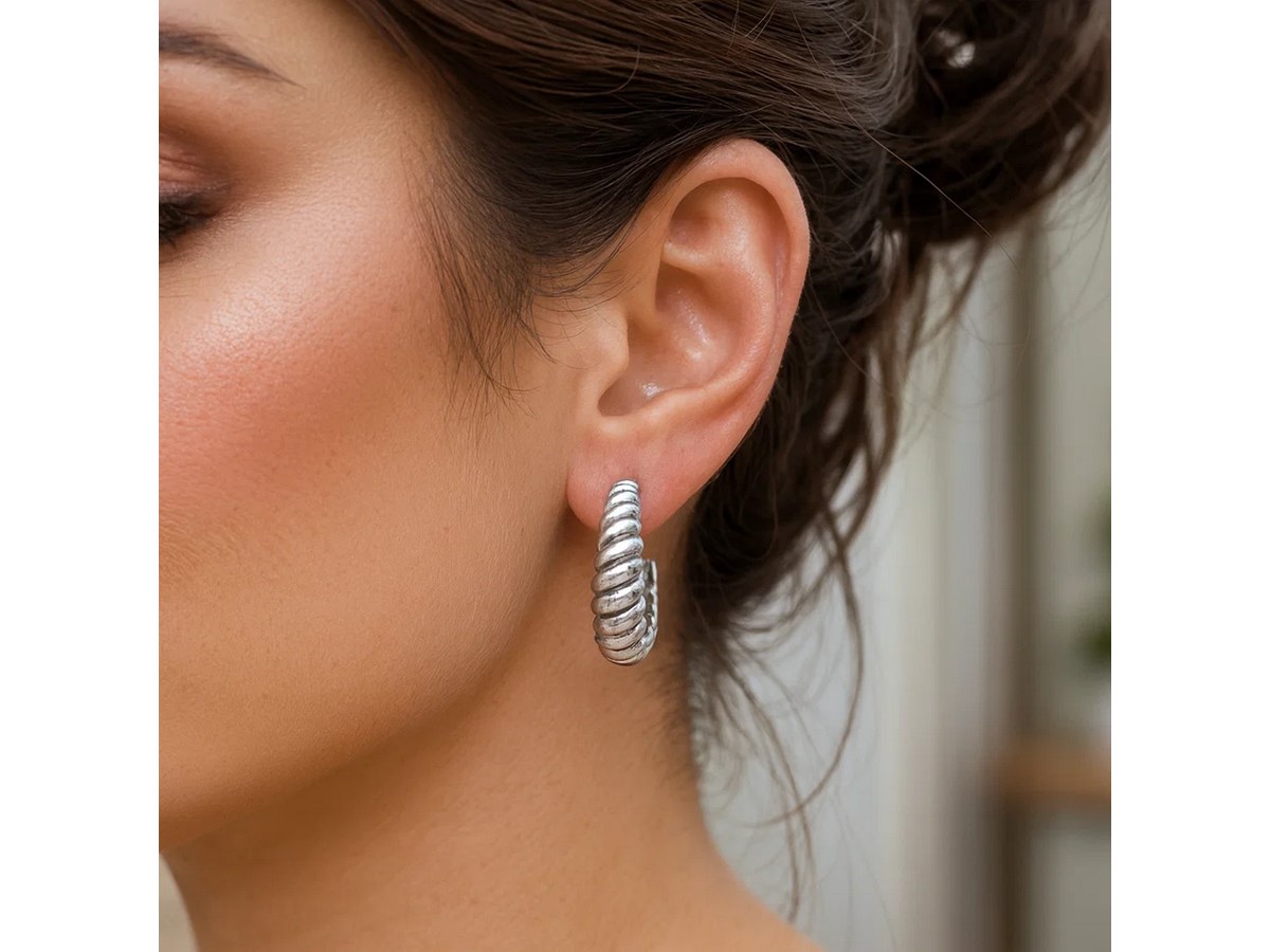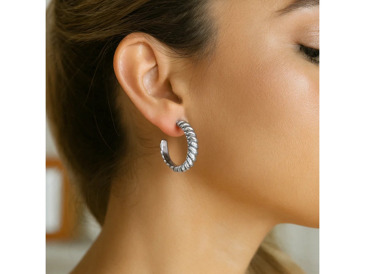 Striking sterling silver rhodium plated large ribbed twisted hoop earrings featuring an elegant interlaced design with a radiant polished finish. The ribbed twist adds texture and movement, while the rhodium plating enhances shine for a bold yet refined statement look.