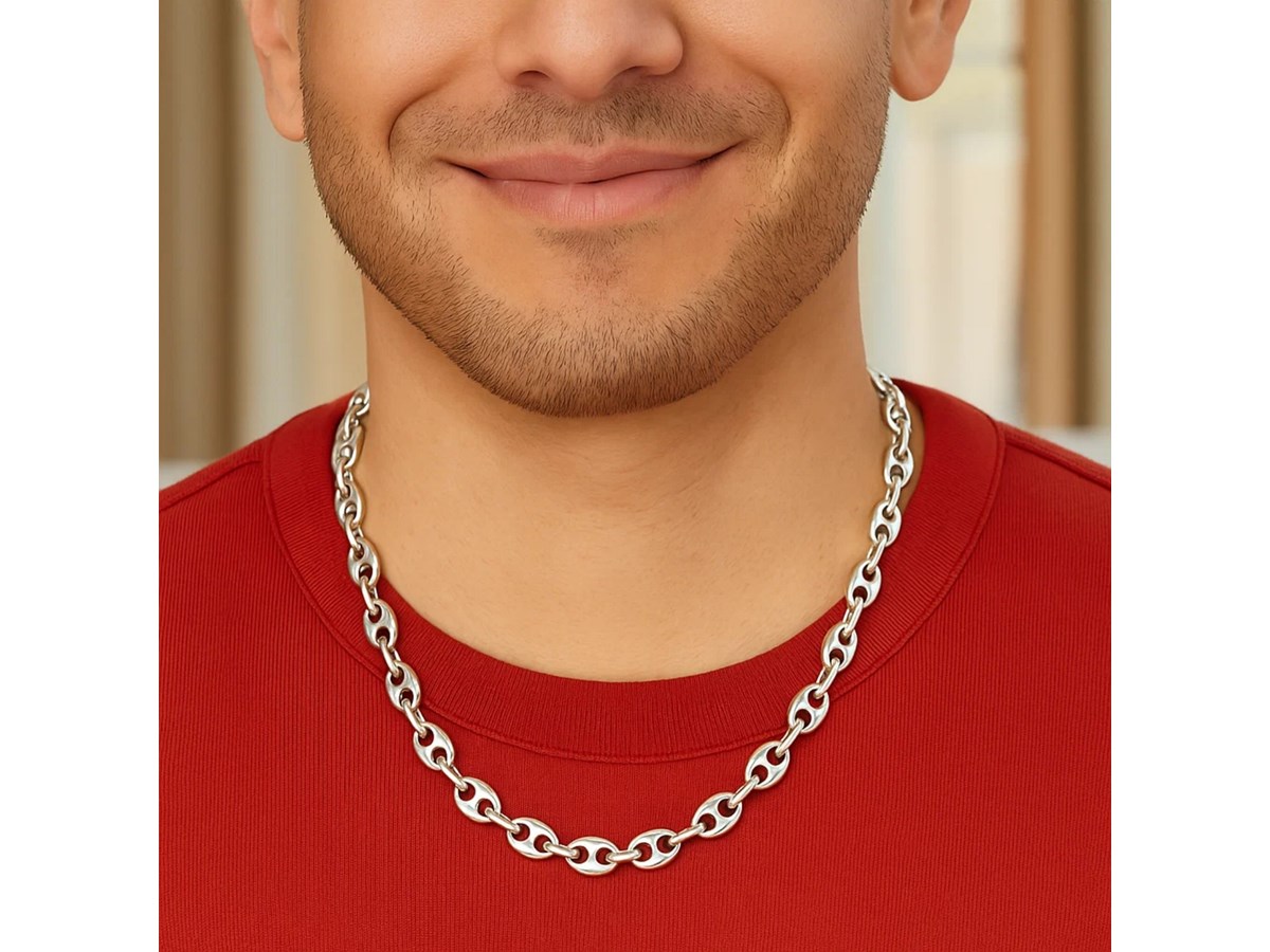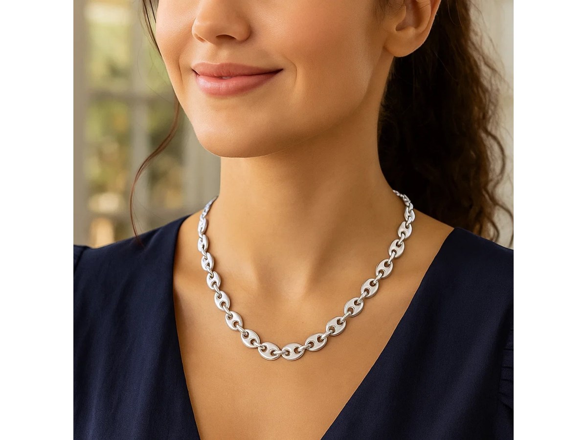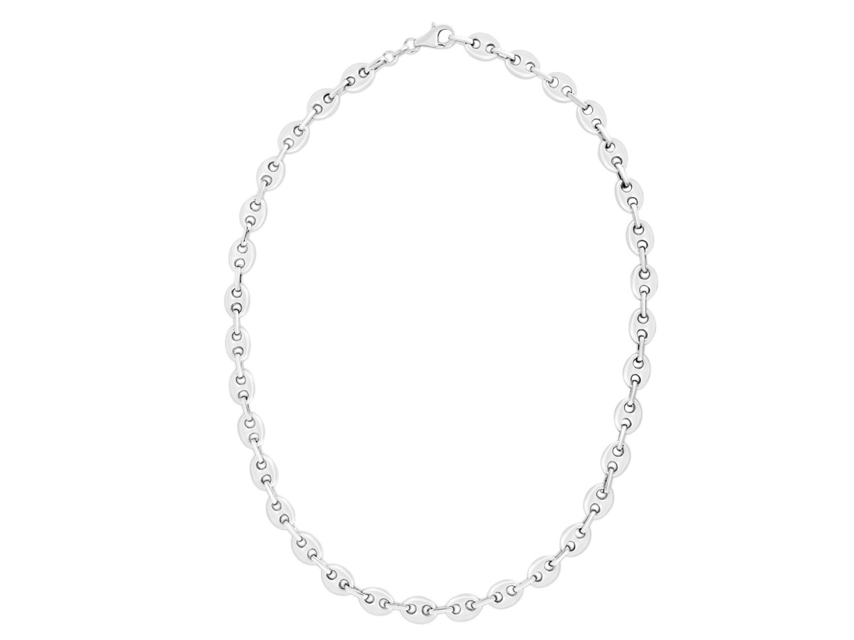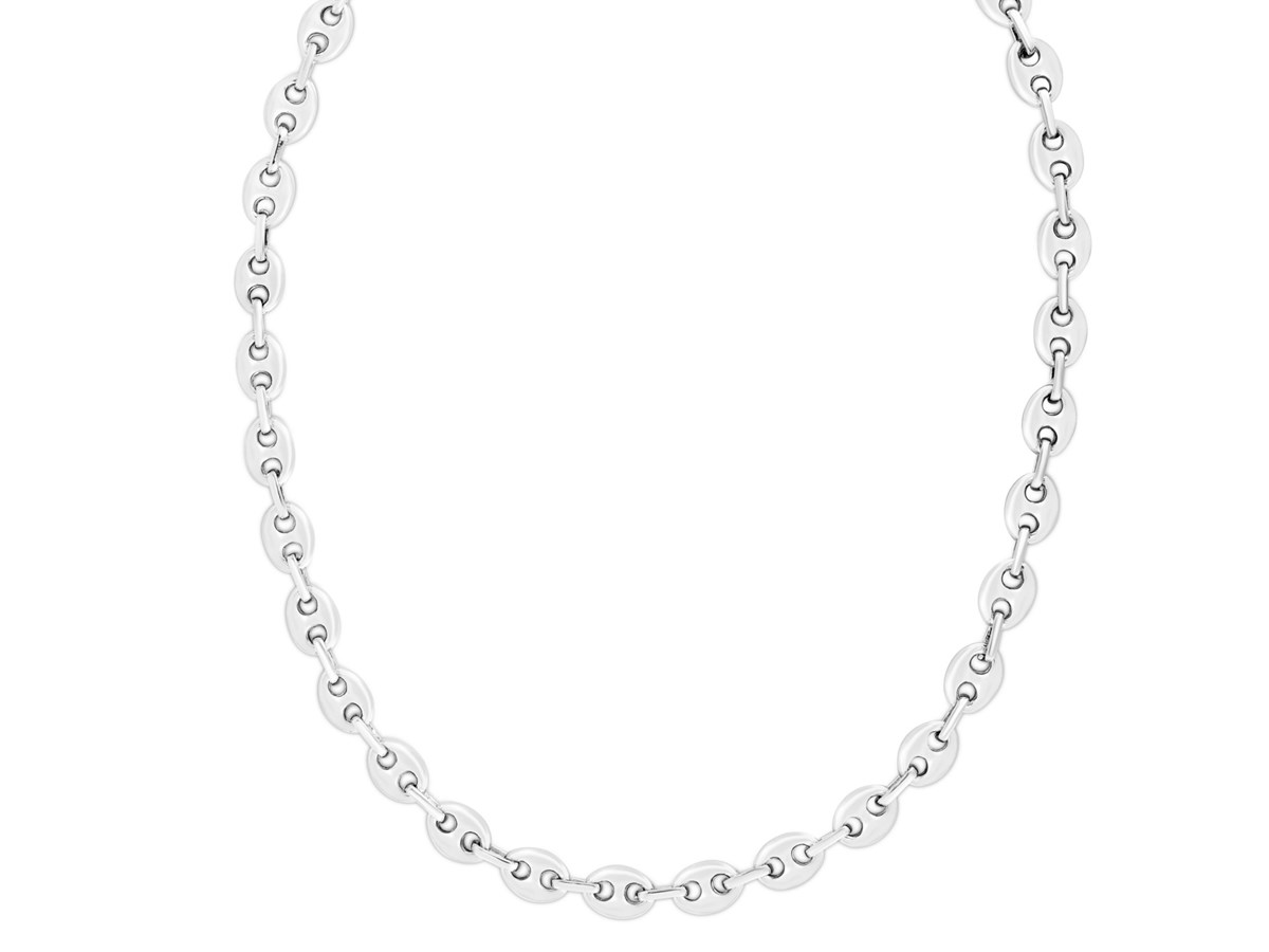 Crafted in sterling silver with a sleek rhodium finish, this 7.80 mm lite puffed mariner chain features airy oval links with a classic bar center, offering a bold yet lightweight design and a bright polished shine that’s perfect for wearing on its own or with a favorite pendant.