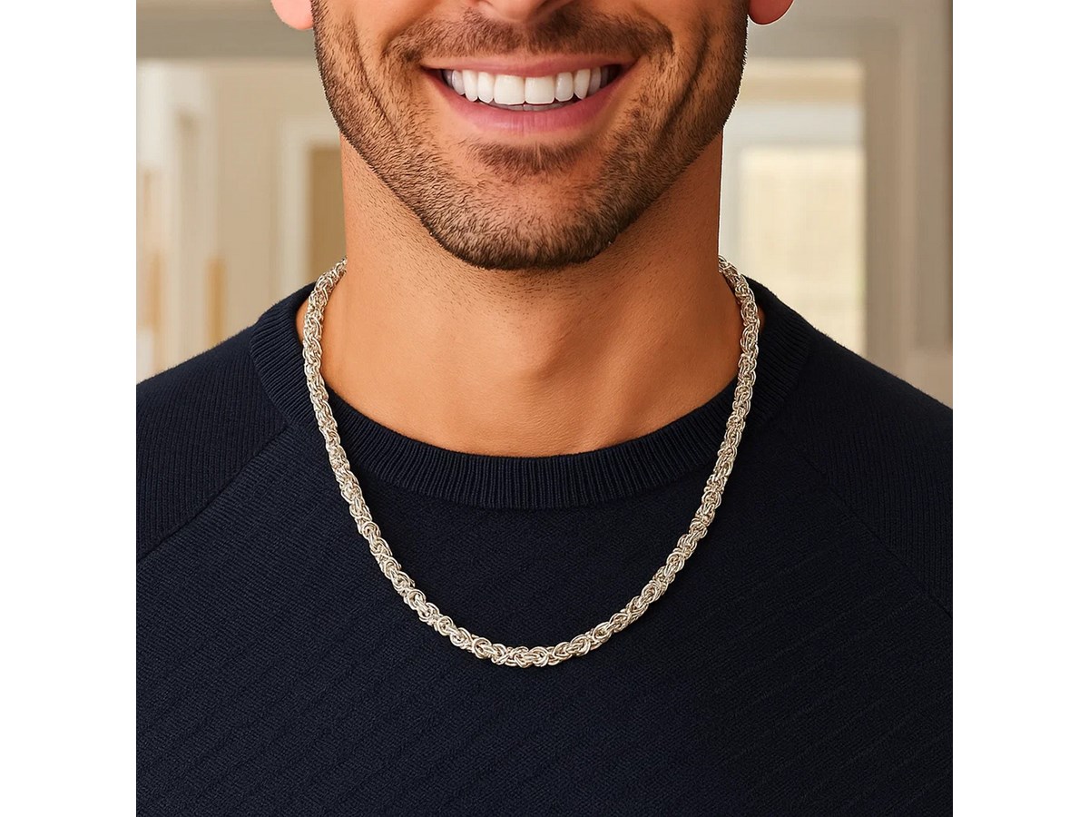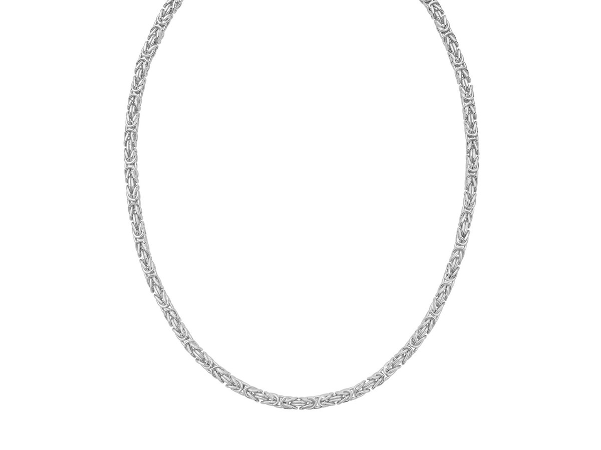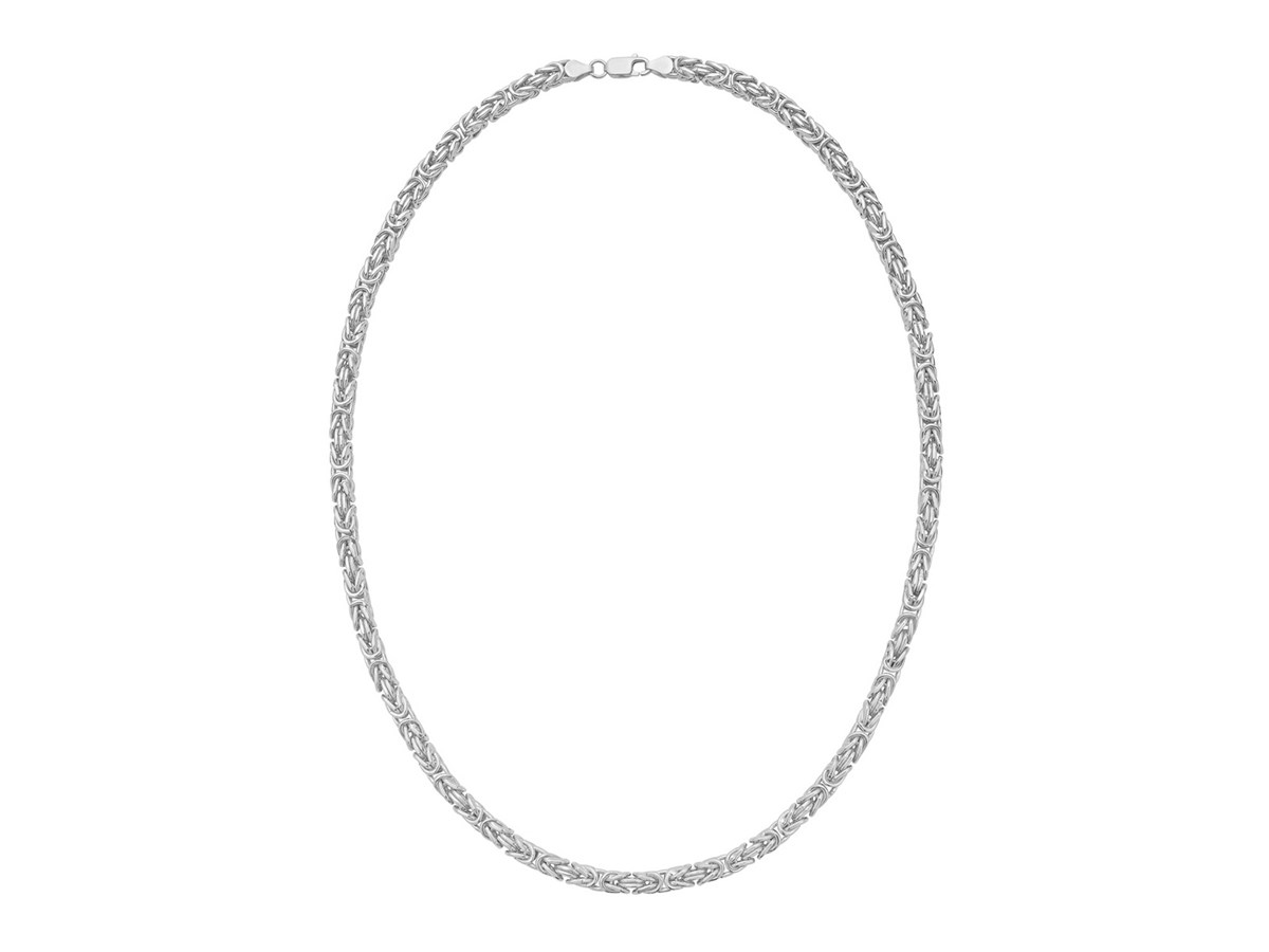 Crafted in sterling silver with a bright rhodium finish, this 4.80 mm lite square Byzantine chain features intricately patterned, squared links that create a distinctive geometric texture and refined shine, offering a bold yet lightweight design perfect for wearing solo or pairing with a standout pendant.