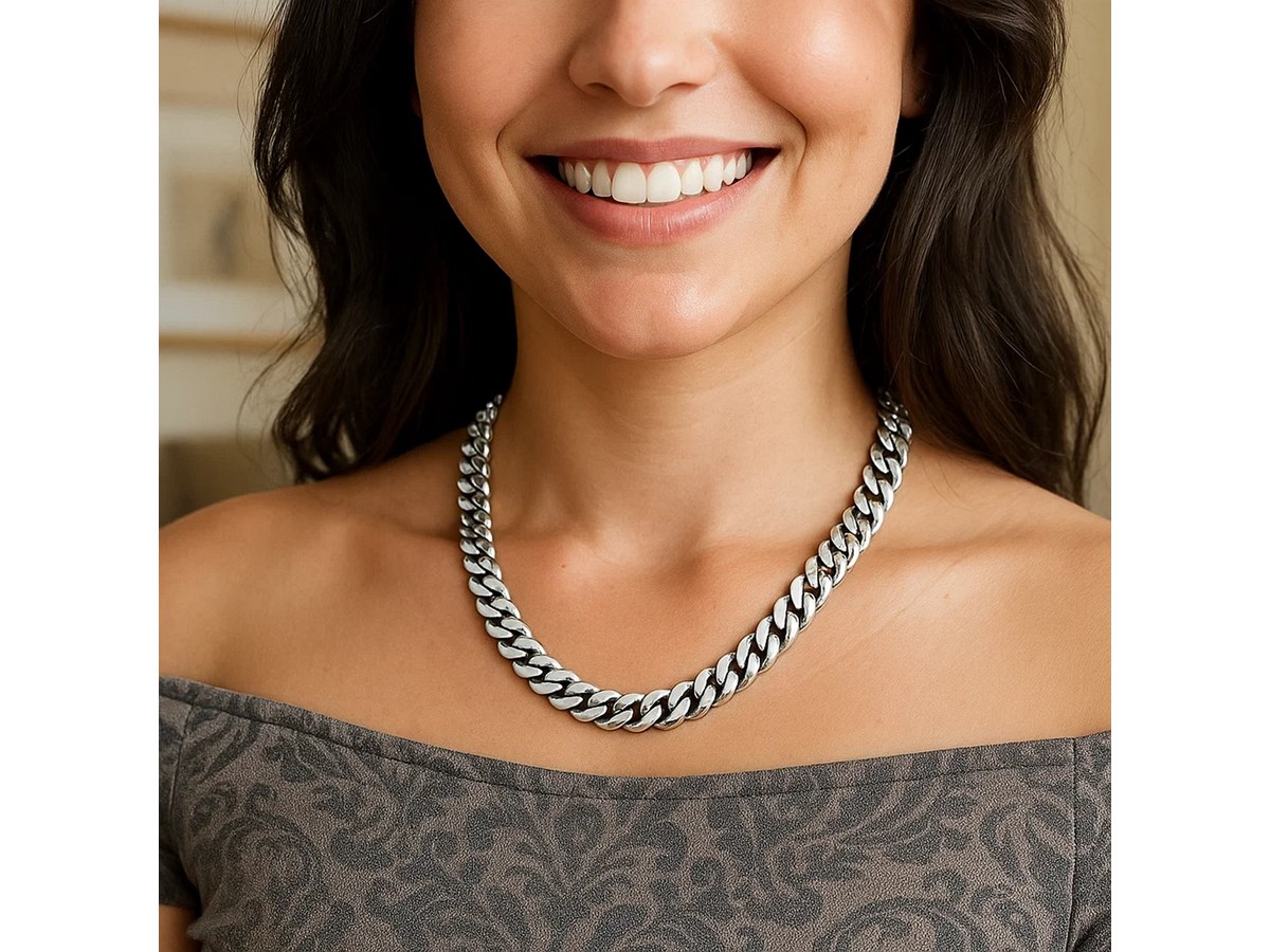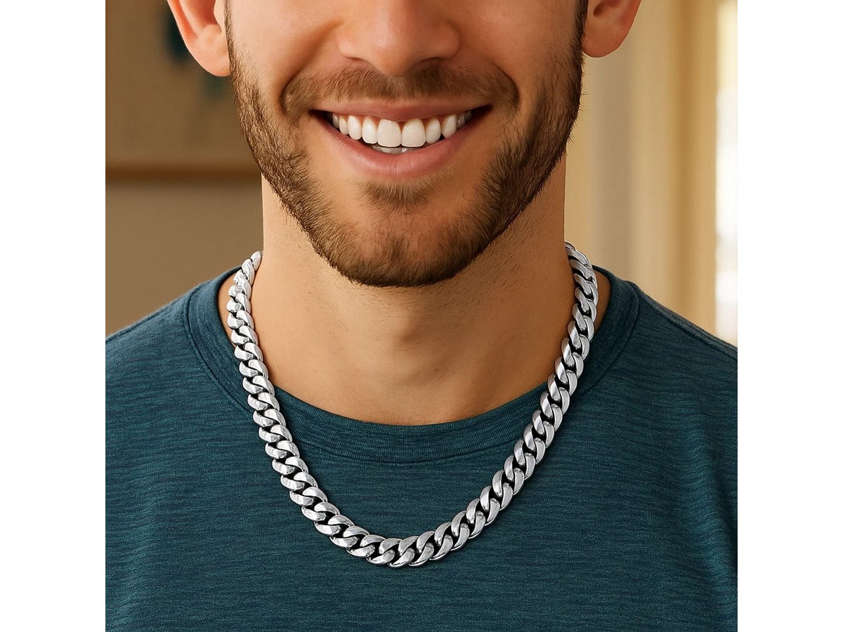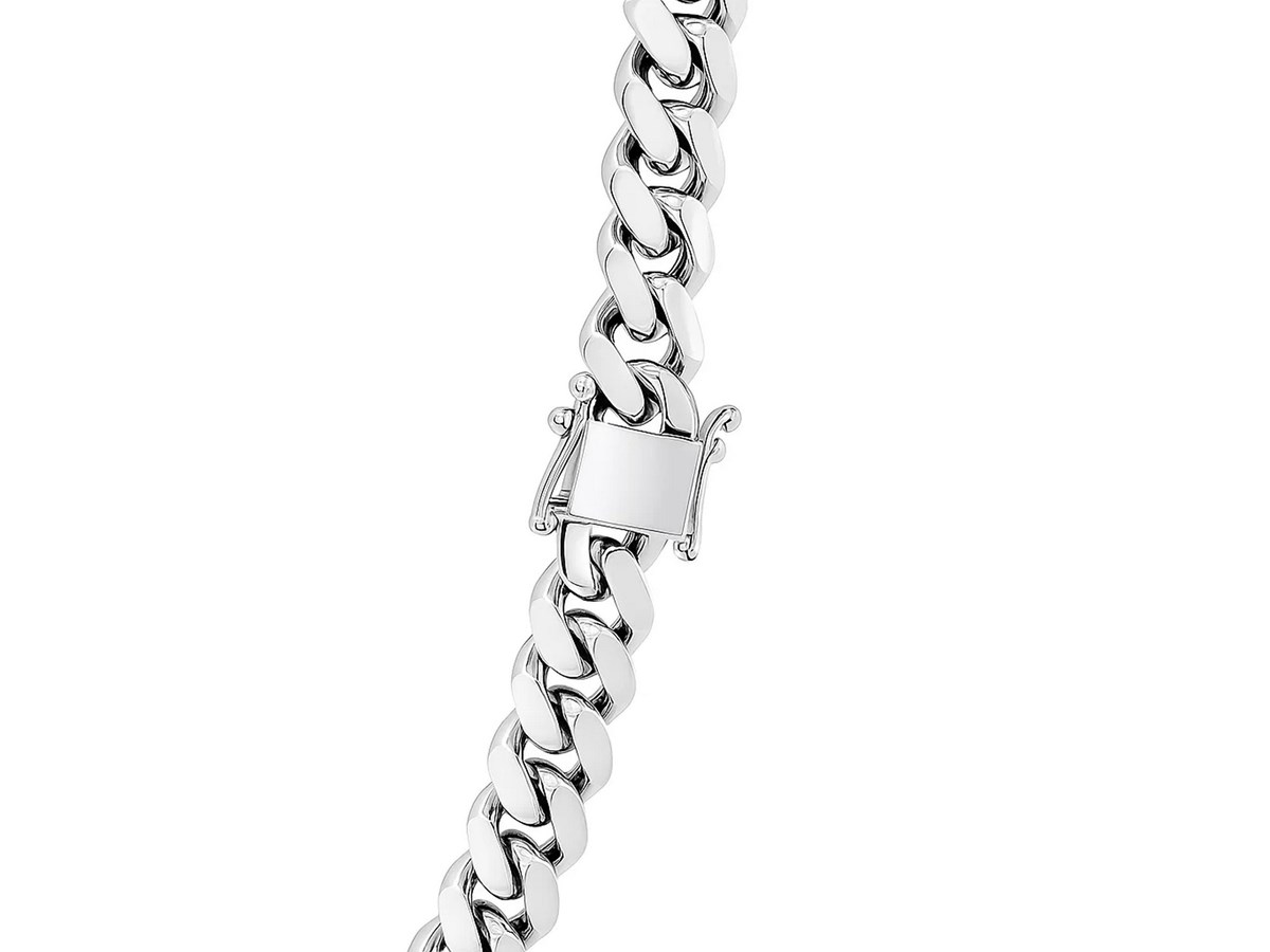 Rhodium plated Miami cuban chain crafted in sterling silver measuring 9.80 millimeters in width. Available in lengths 24 inches and 26 inches.
